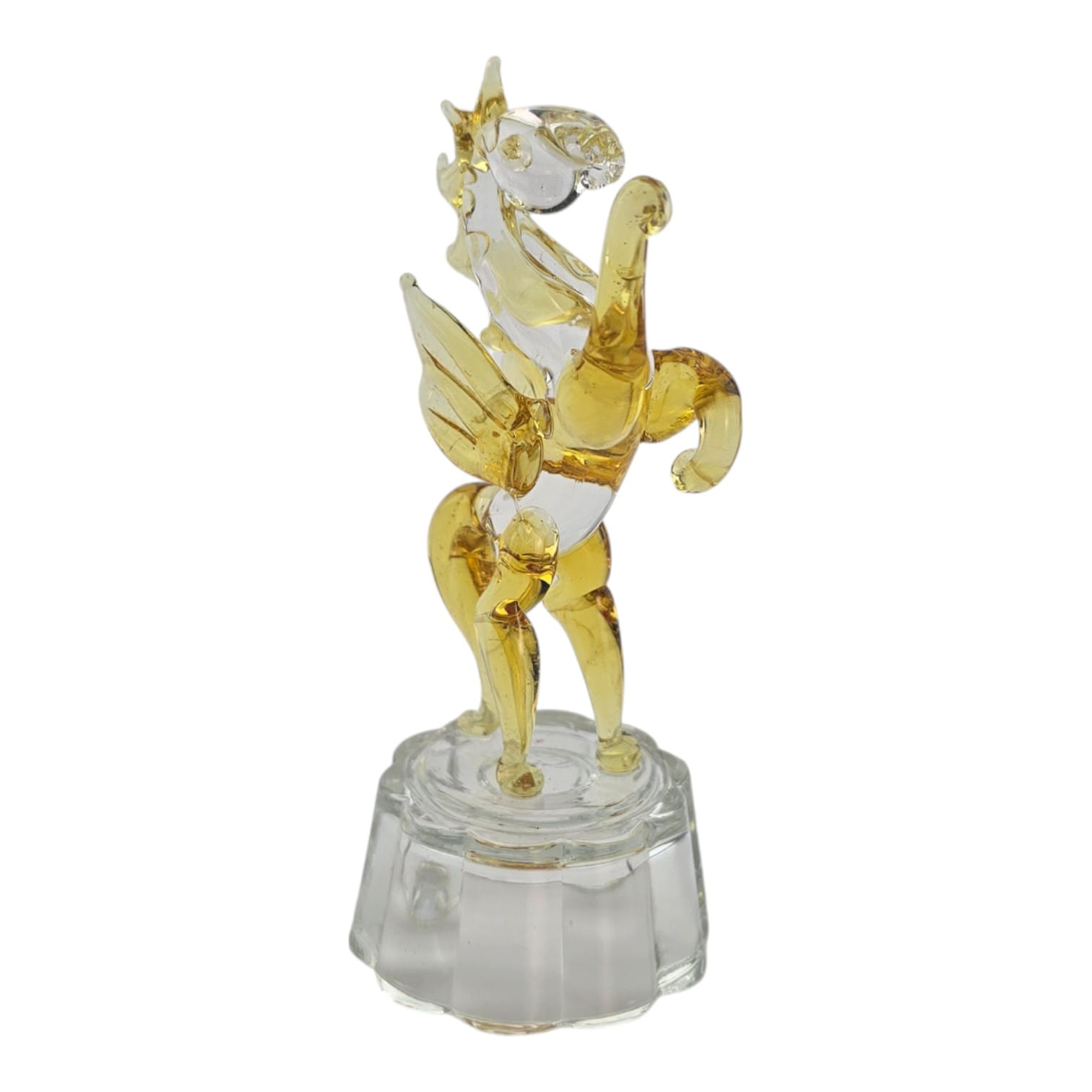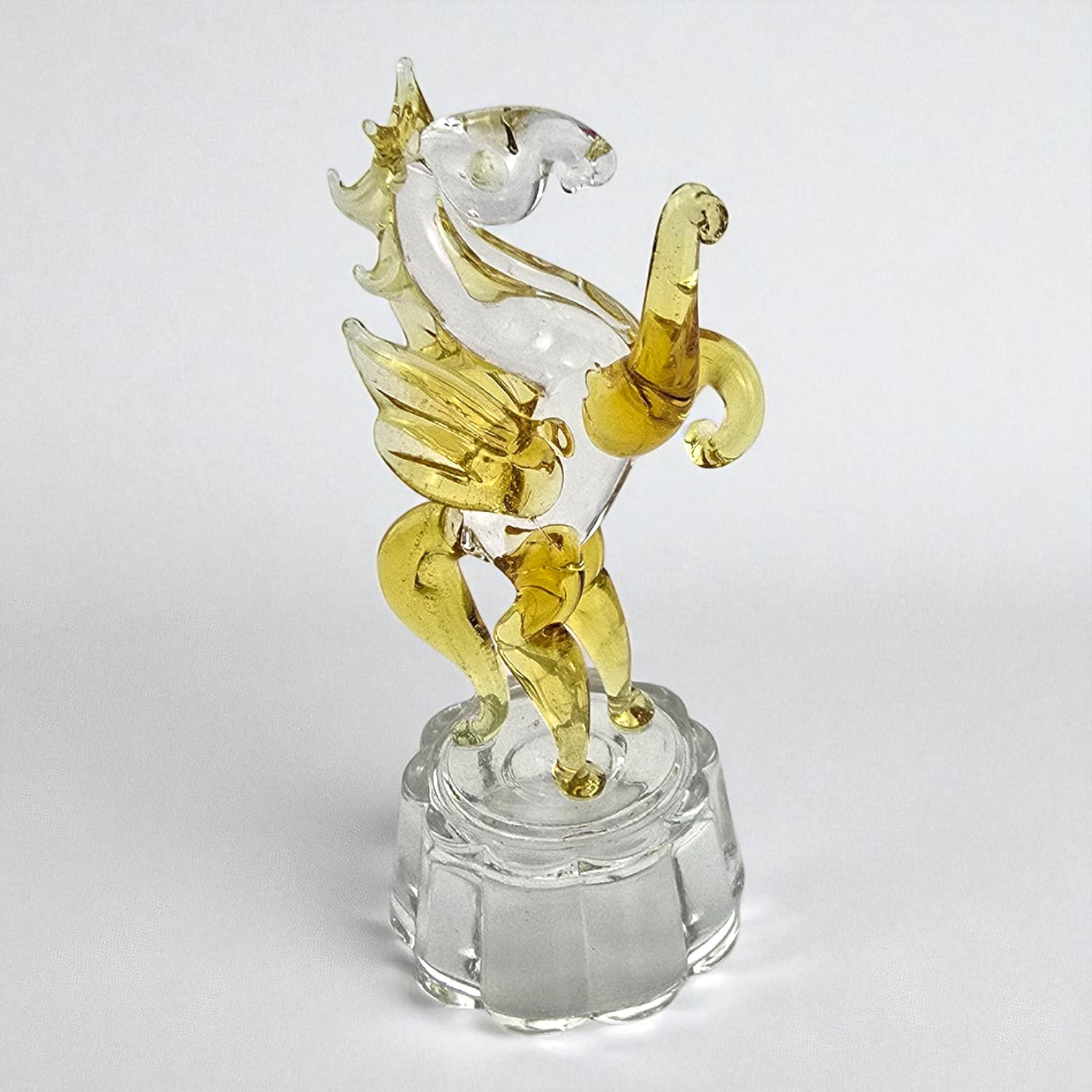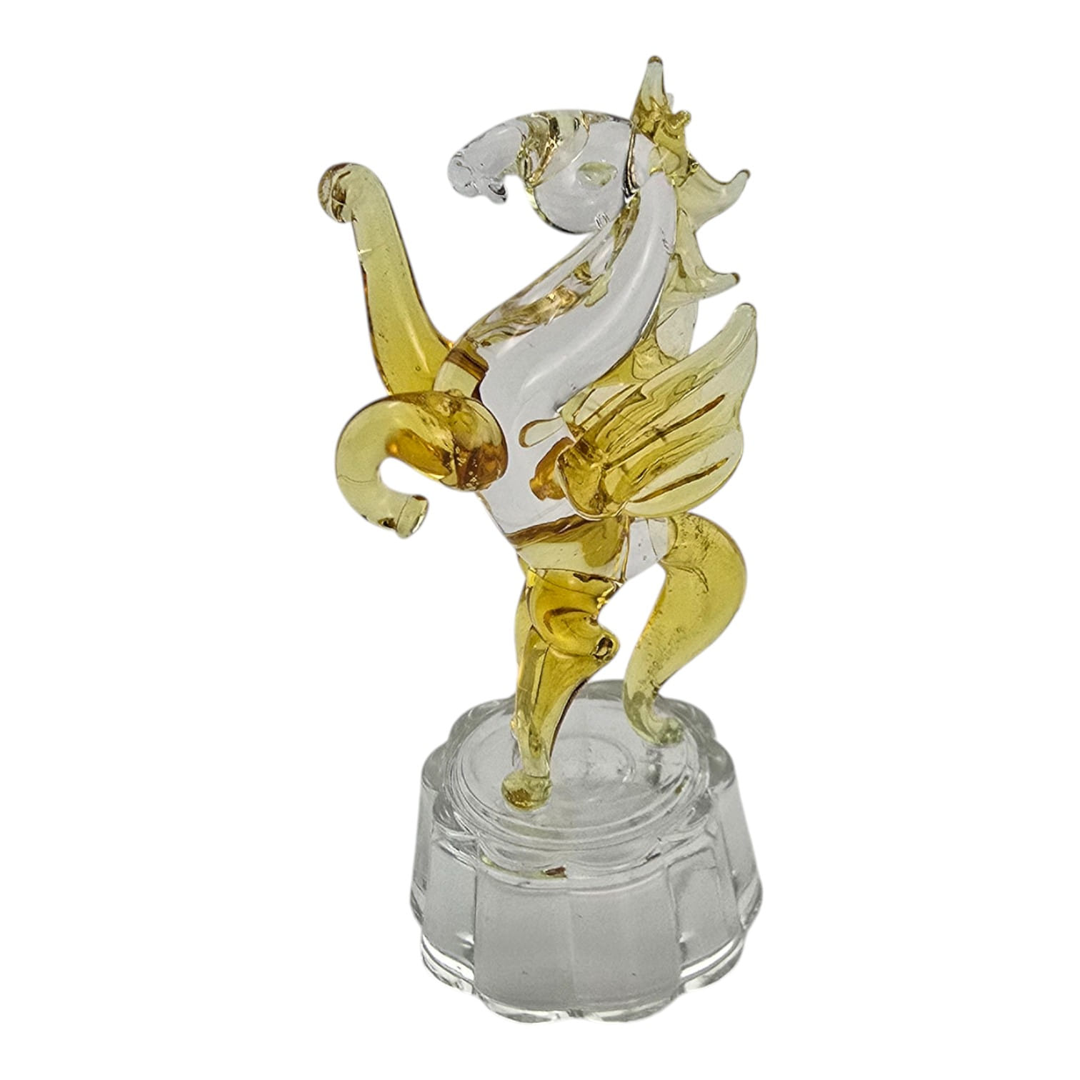 Элегантная настольная статуэтка из кристалла в виде лошади с крыльями (Пегаса). Прозрачное стекло с теплым золотистым оттенком и кристальная подставка красиво играют на свету и украшают интерьер. Подходит для дома и офиса, полок, каминов и фотозон. Отличный символичный подарок к году Лошади и на пожелание успеха, скорости и вдохновения.