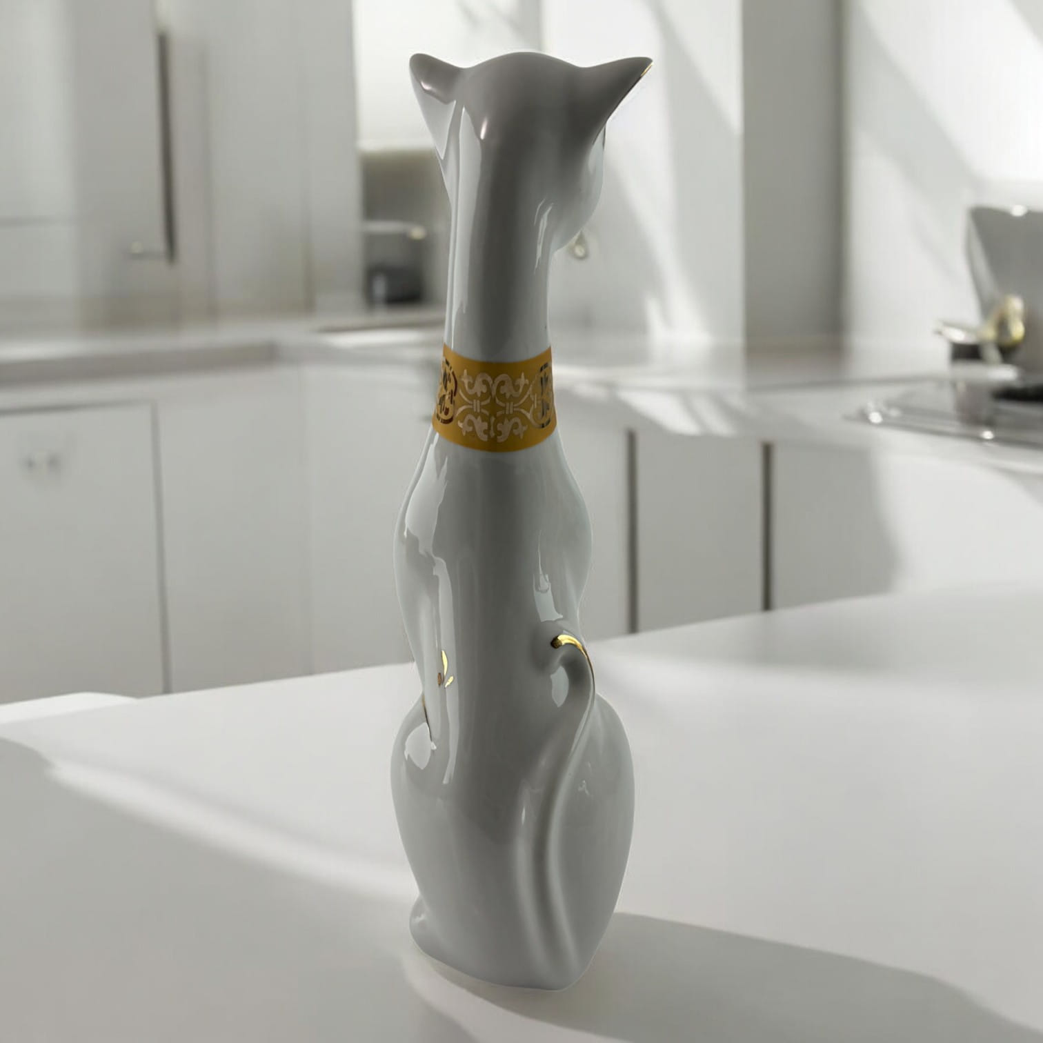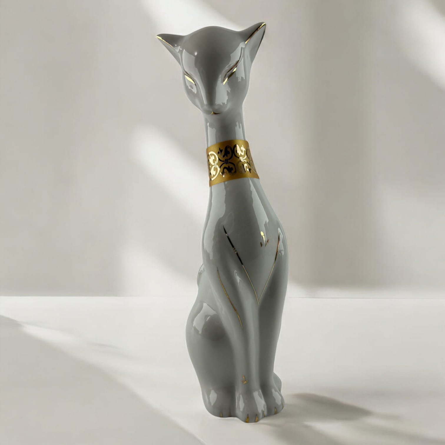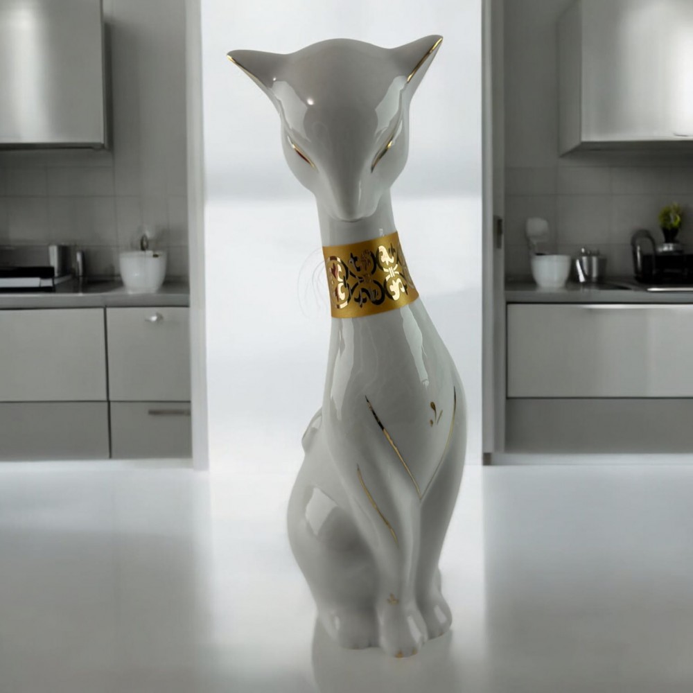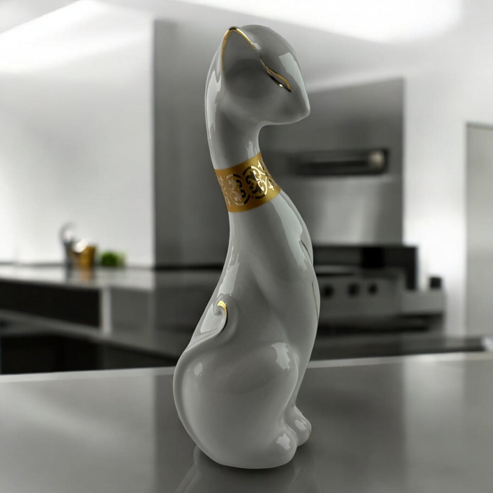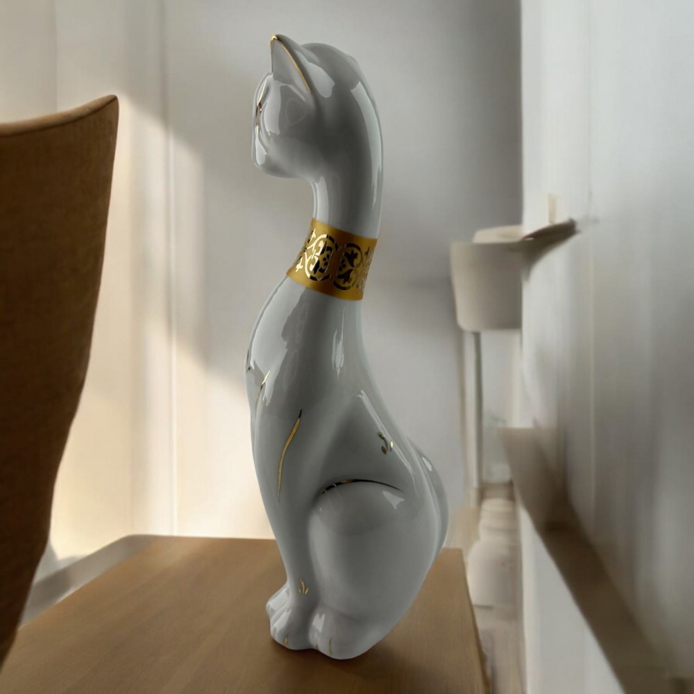 Фарфоровая кошка украшена изящными золотыми деталями на шее и ушках, что придает ей особое благородство и привлекает внимание к тонким линиям фигурки. Она станет прекрасным подарком для ценителей изящных предметов декора, символизируя утонченность и благополучие. Этот декоративный элемент легко впишется как в классический, так и в современный интерьер, добавив нотку стиля и шарма в ваш дом.