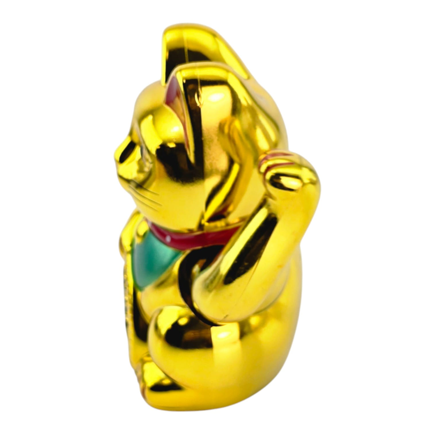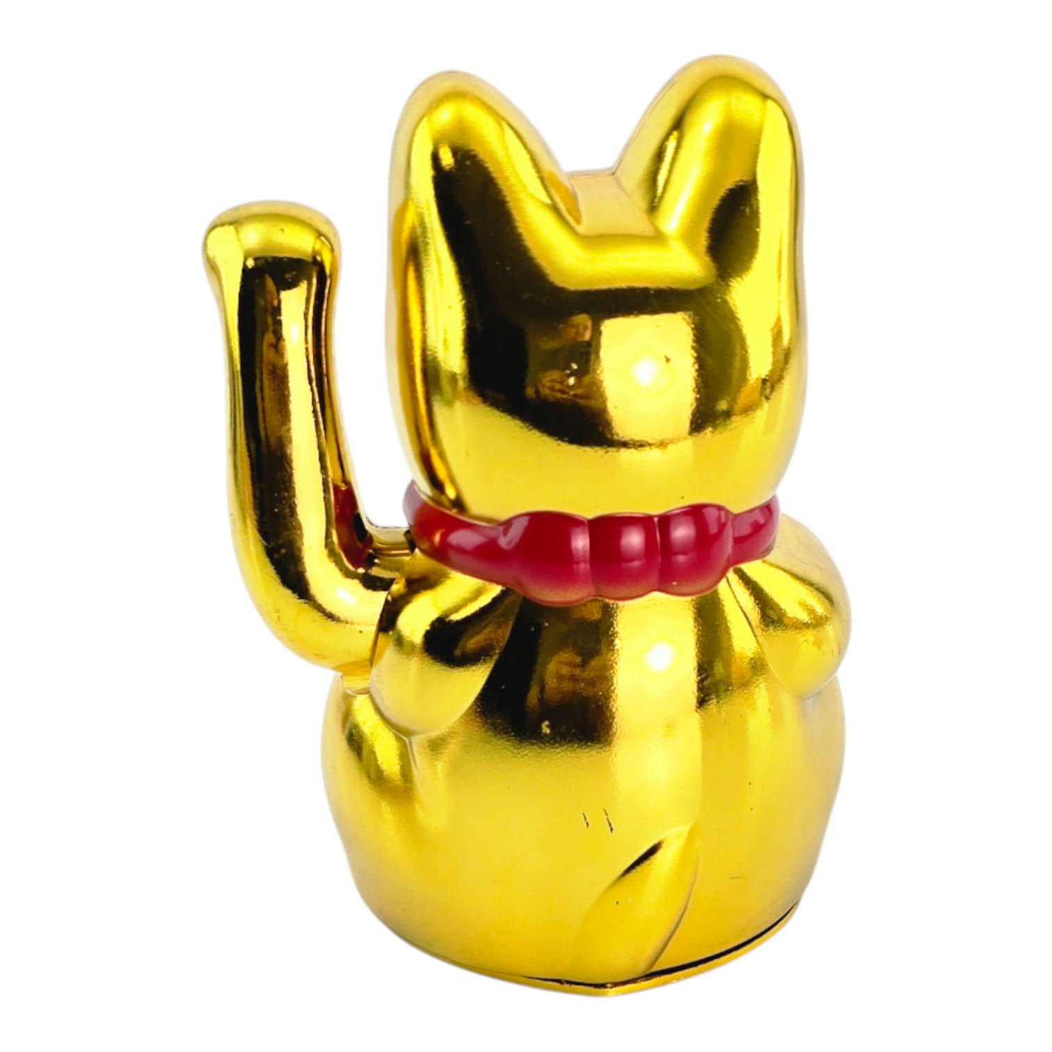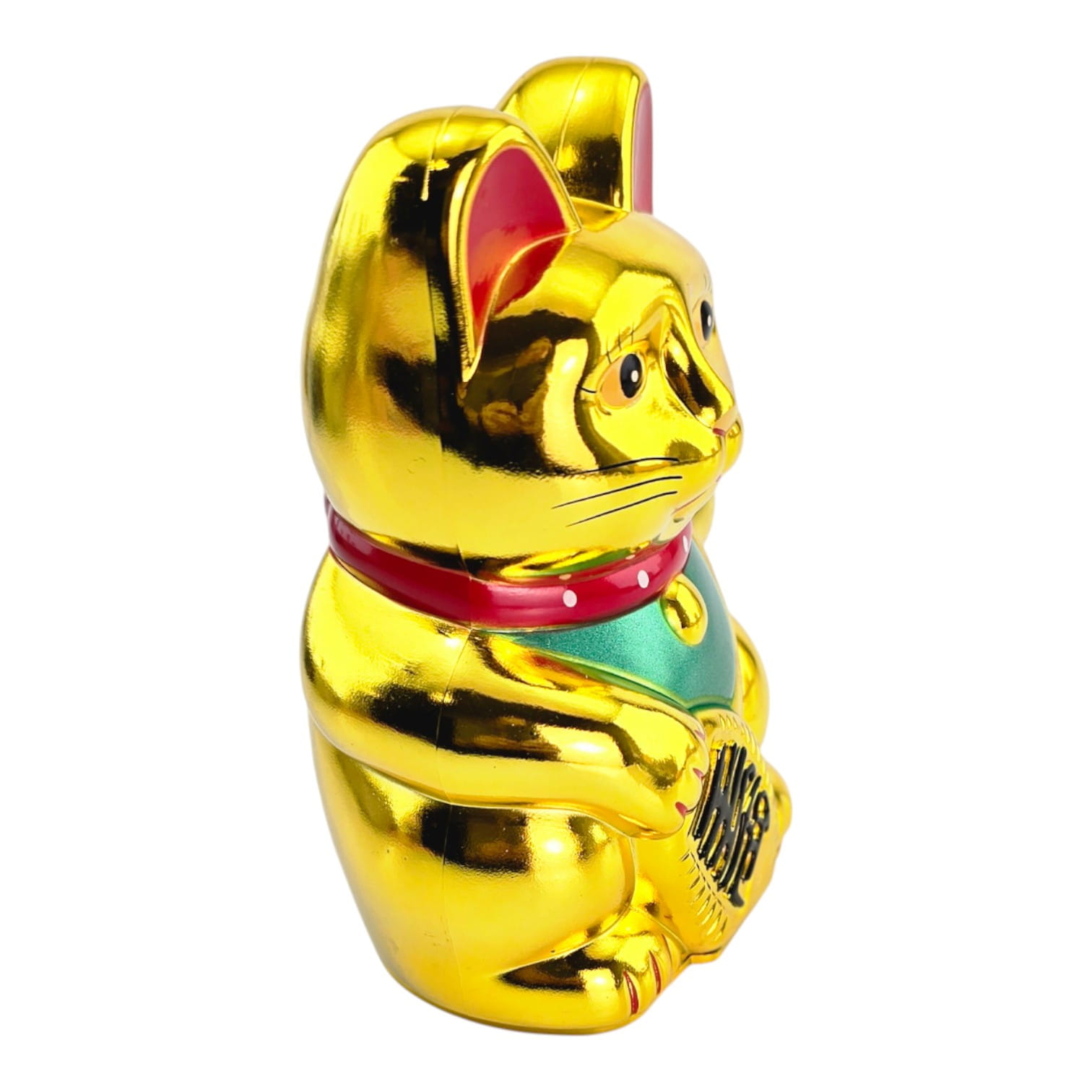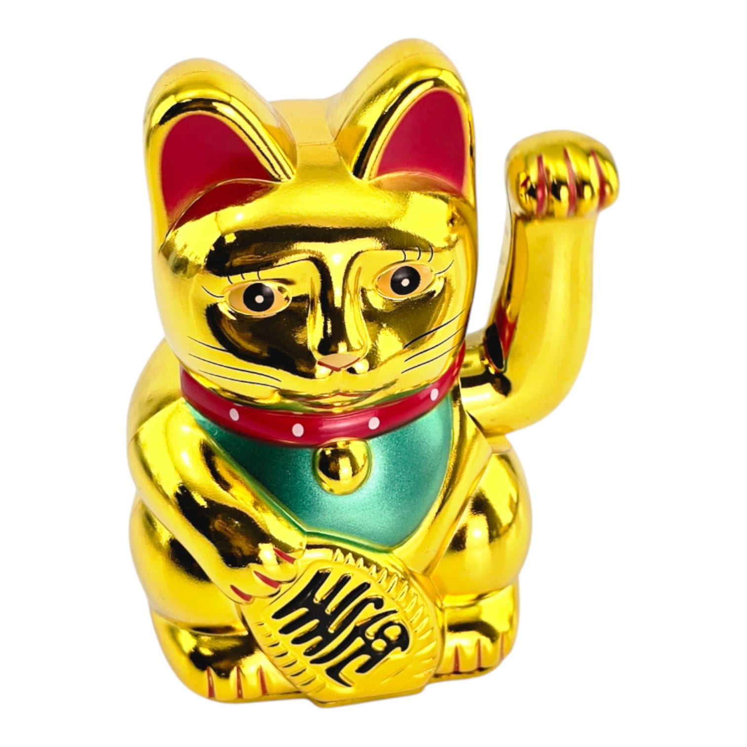 В лапе кошка держит овальную монету кобан с иероглифами «большие деньги». Золотой цвет у манэки-неко символизирует богатство, а поднятая правая лапка чаще ассоциируется с привлечением денег и успеха в делах (фигурку ставят у кассы или у входа).
