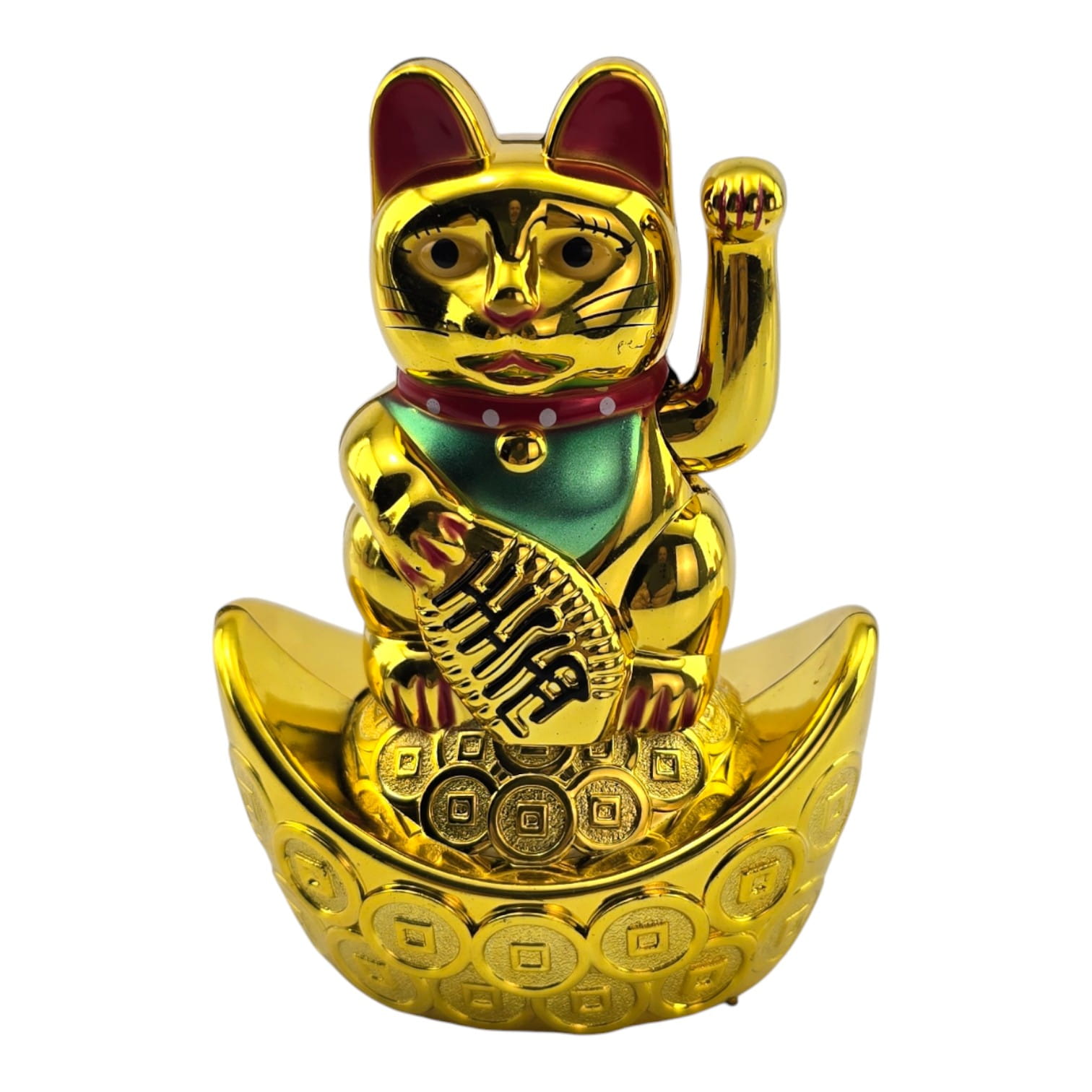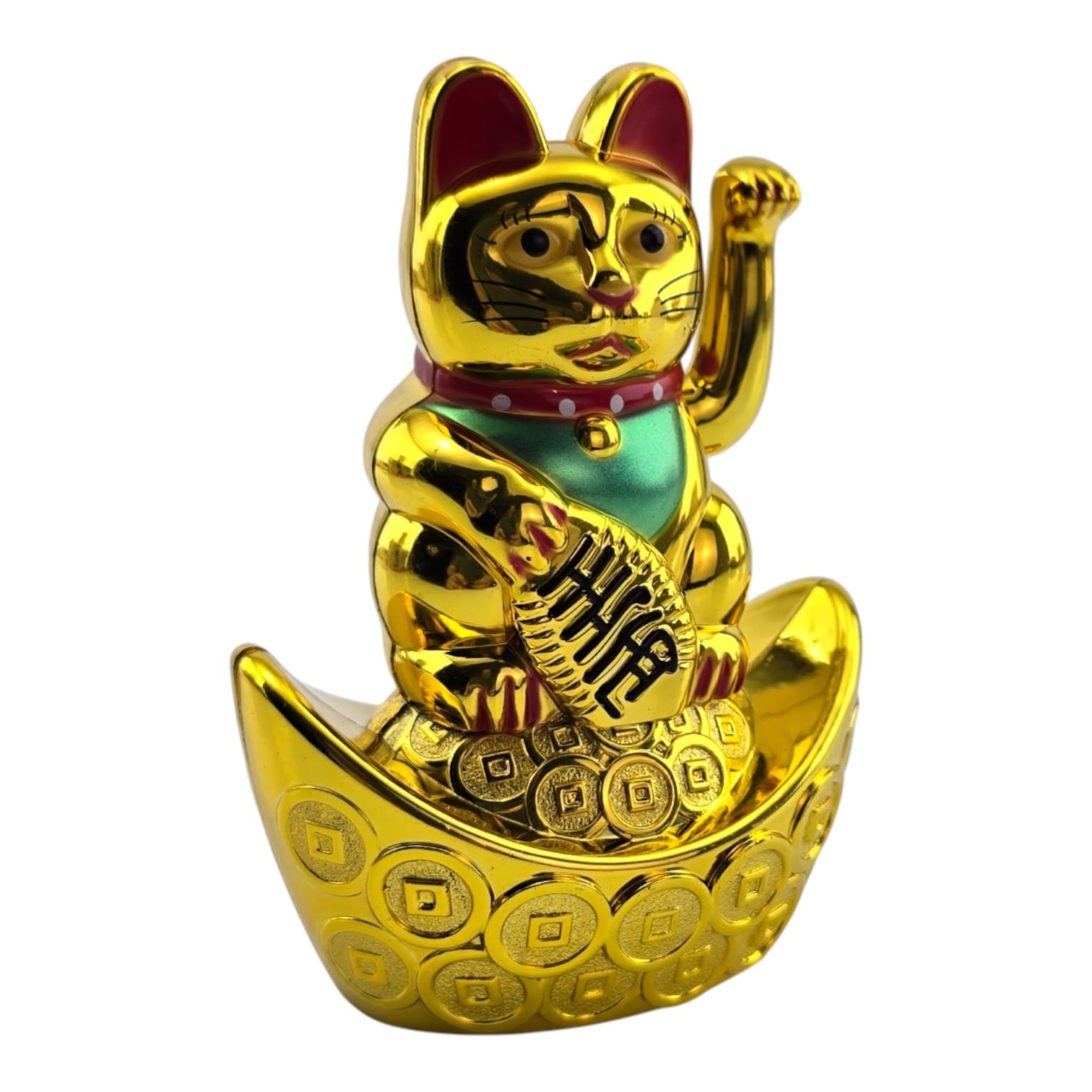 Классический японский талисман Манэки-нэко - «кошечка, зовущая удачу и деньги». Фигурка стоит на «золотой лодочке» с монетами, в лапе держит овальную монету-кобан с иероглифами достатка. Поднятая правая лапка ритмично машет, привлекая клиентов и финансовый успех. Ставят у входа, на кассе или ресепшене магазина, в кафе и салонах, в кабинете и дома на полке или рабочем столе. Работает от одной батарейки AAA (в комплект не входит).