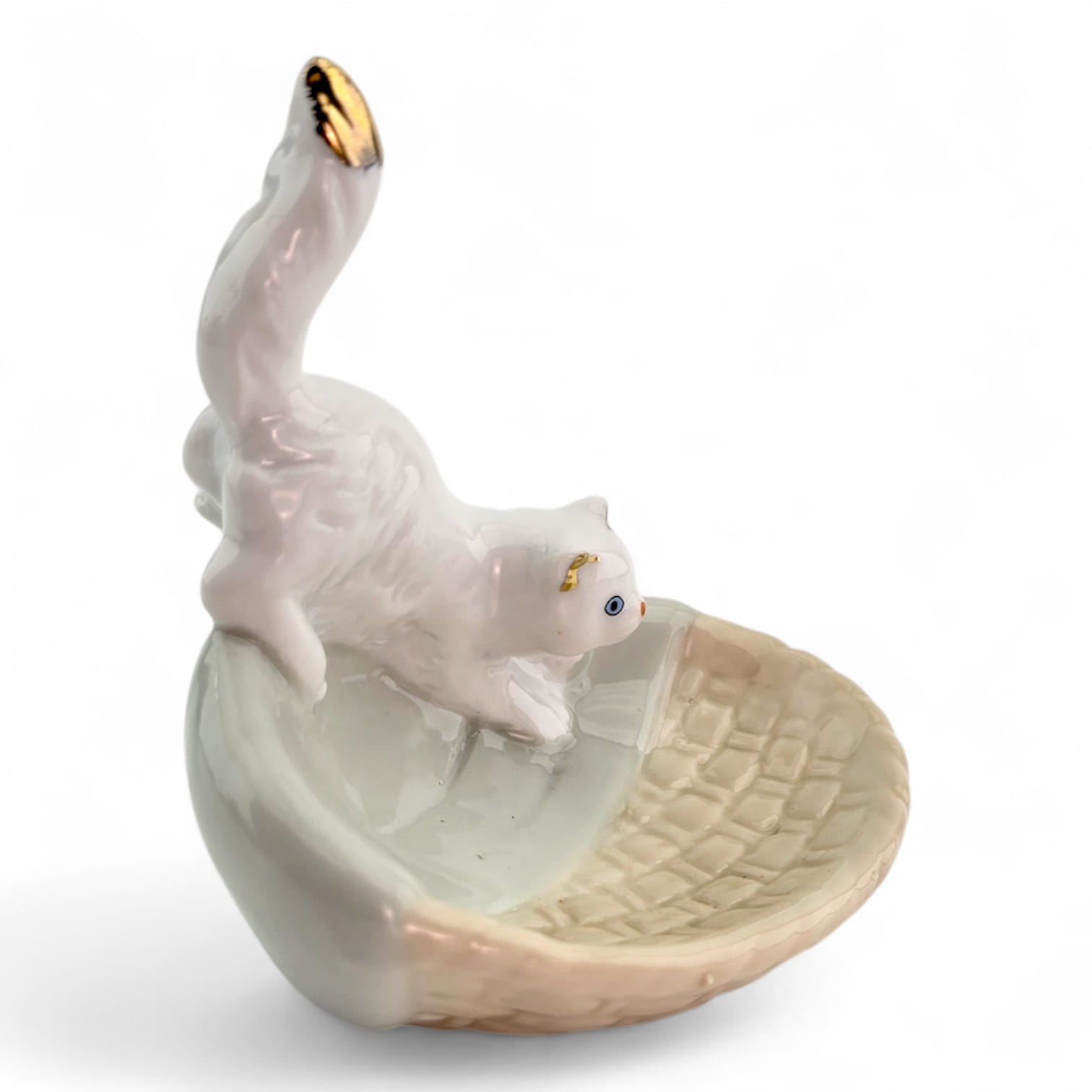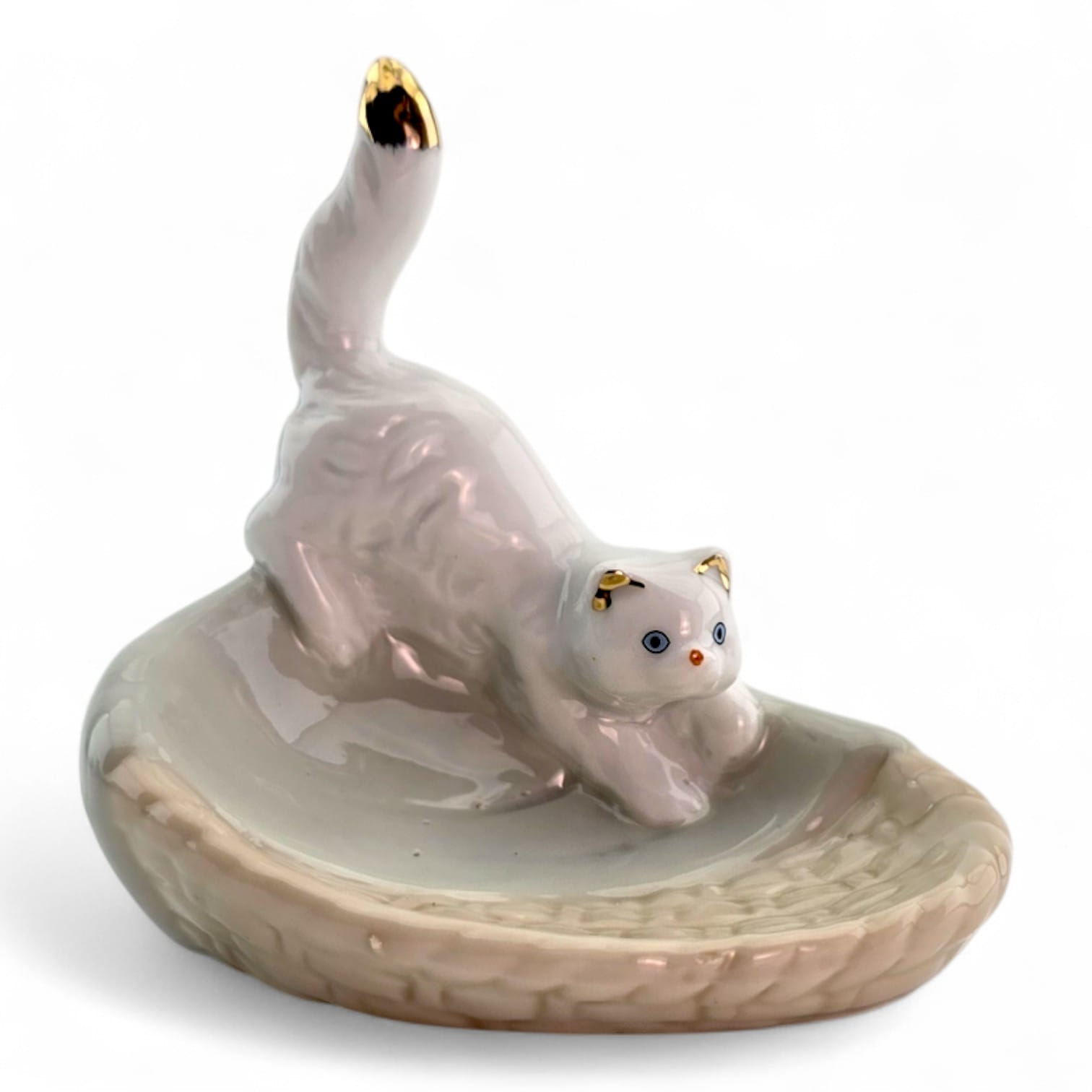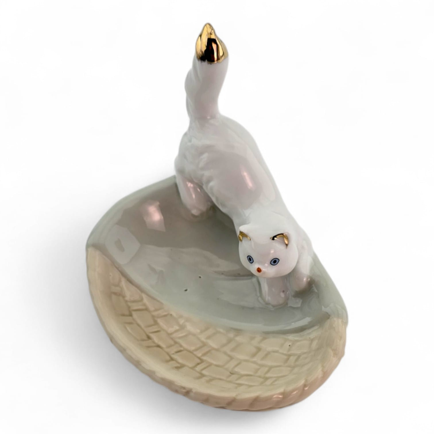 Милый керамический лоточек в виде корзинки с котиком. Небольшая глянцевая тарелочка с золотистыми акцентами подходит для колец, серёг, браслетов и мелочей на туалетном столике. Также можно использовать как мини-мыльницу. Аккуратный домашний декор и приятный подарок любителям кошек. Из-за особенностей ручного декора цвет и мелкие детали могут немного отличаться от фото.