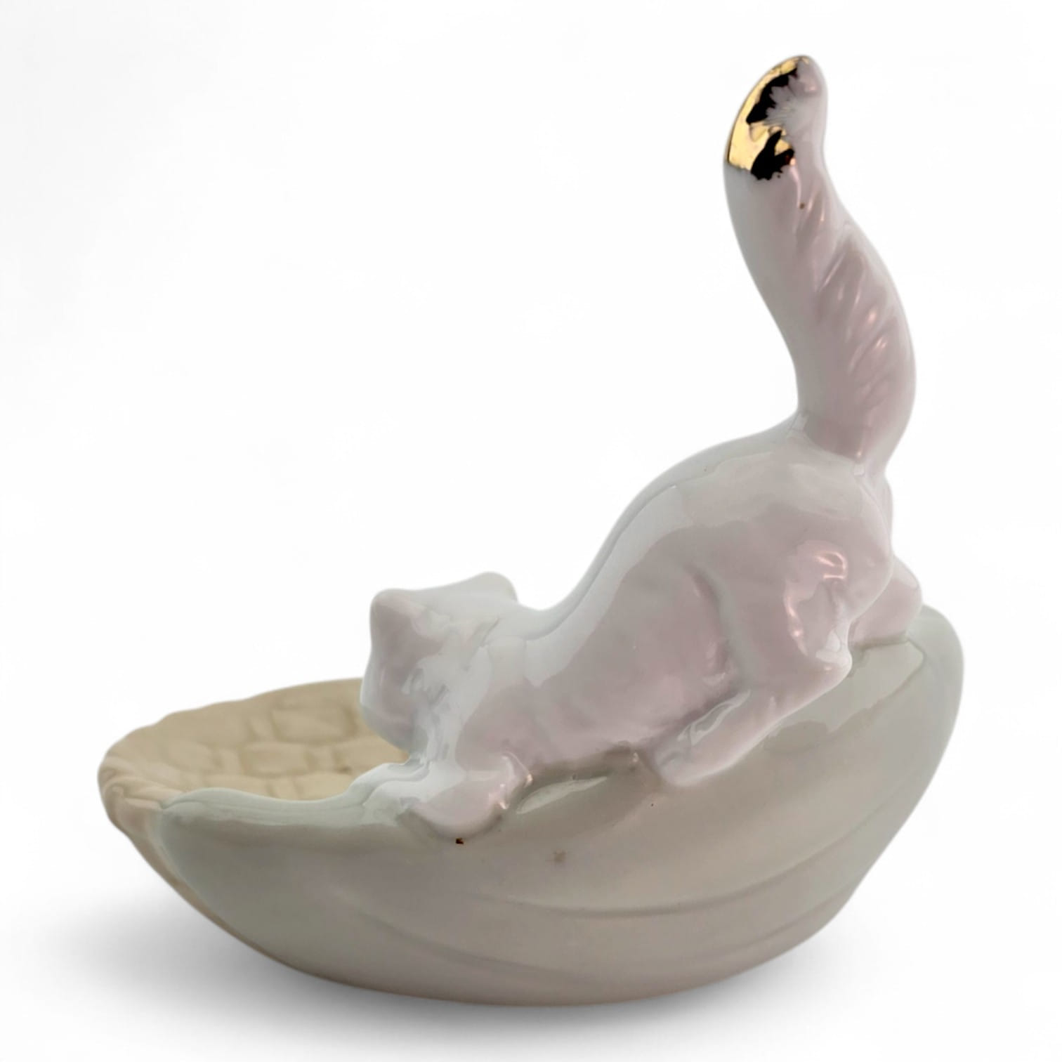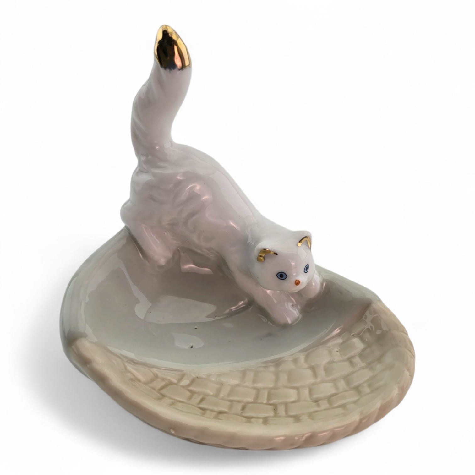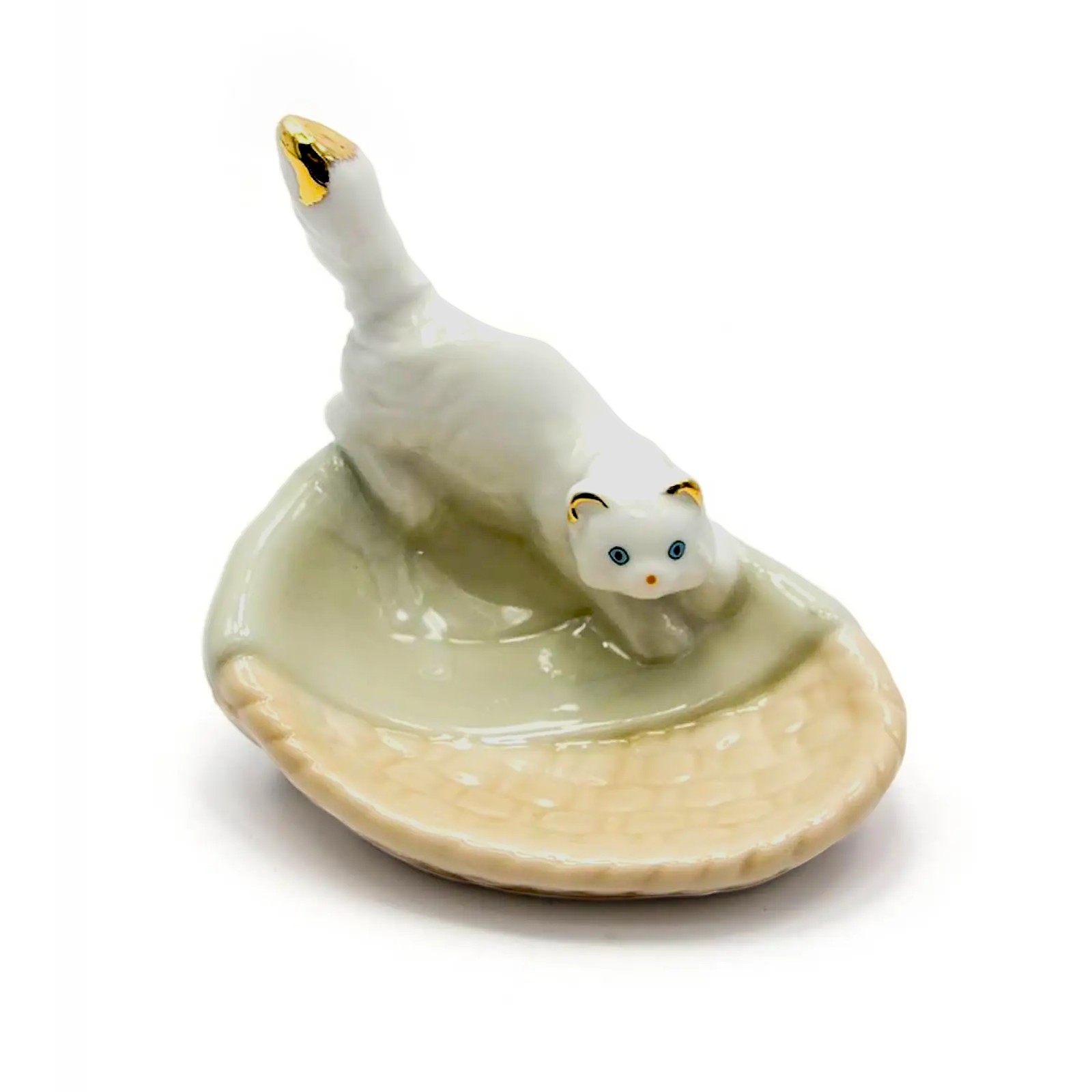 Милый керамический лоточек в виде корзинки с котиком. Небольшая глянцевая тарелочка с золотистыми акцентами подходит для колец, серёг, браслетов и мелочей на туалетном столике. Также можно использовать как мини-мыльницу. Аккуратный домашний декор и приятный подарок любителям кошек. Из-за особенностей ручного декора цвет и мелкие детали могут немного отличаться от фото.