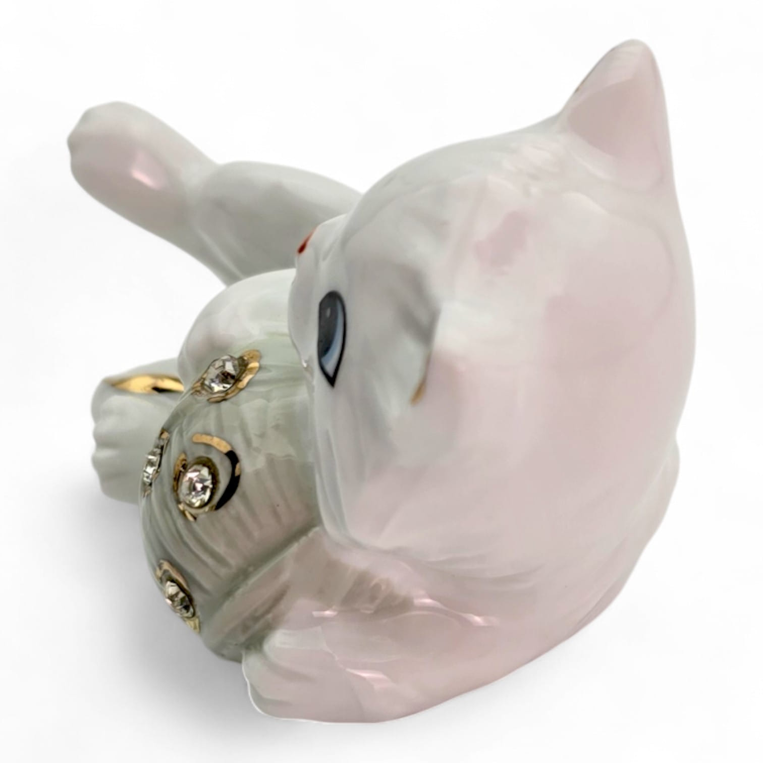 Очаровательная фарфоровая статуэтка в виде белого котёнка с клубком ниток. Глянцевая поверхность, золотистые акценты и стразы подчёркивают детали и красиво переливаются. Подойдёт для полки, туалетного столика или камина, а также как приятный подарок любителям кошек и коллекционерам мини-статуэток.