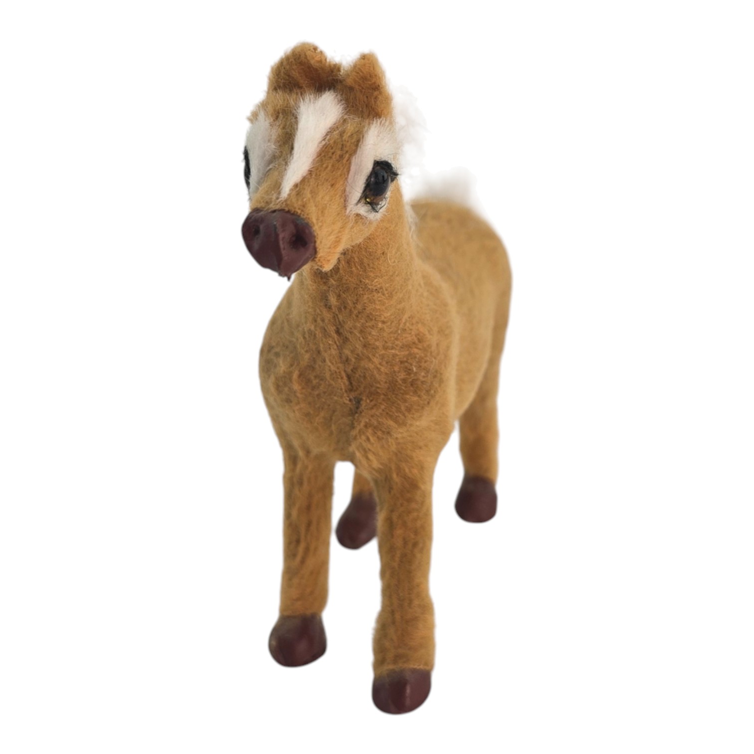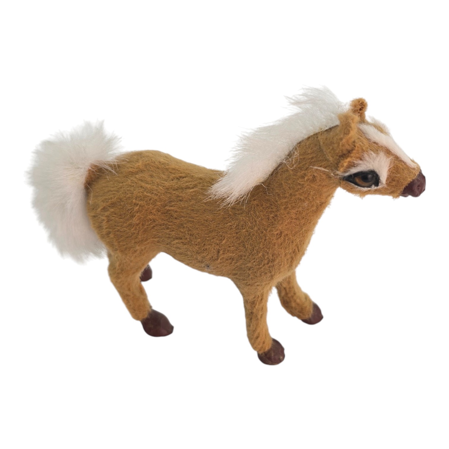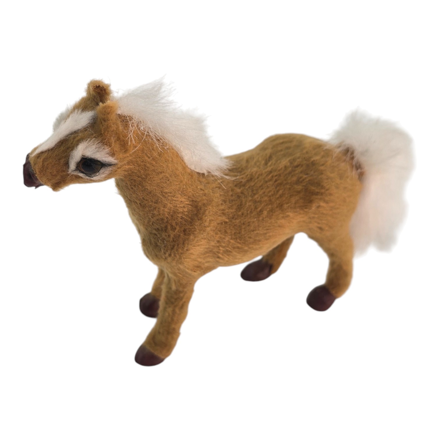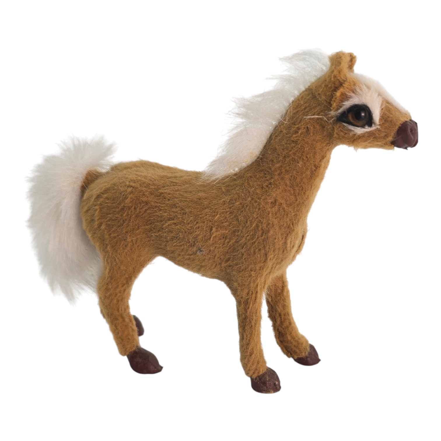 Небольшая декоративная фигурка лошади с натуральным мехом. Светло-коричневый окрас и белая грива выглядят натурально, поэтому модель органично смотрится на полке, рабочем столе или в детской. Лошадь выбирают как символ силы, успеха и движения вперёд, а также как тематический подарок к Году Лошади. Изделие выполнено вручную индийскими мастерами, поэтому возможны лёгкие отличия от фото — у каждой фигурки свой характер. Уход простой: периодически снимайте пыль мягкой кисточкой.
