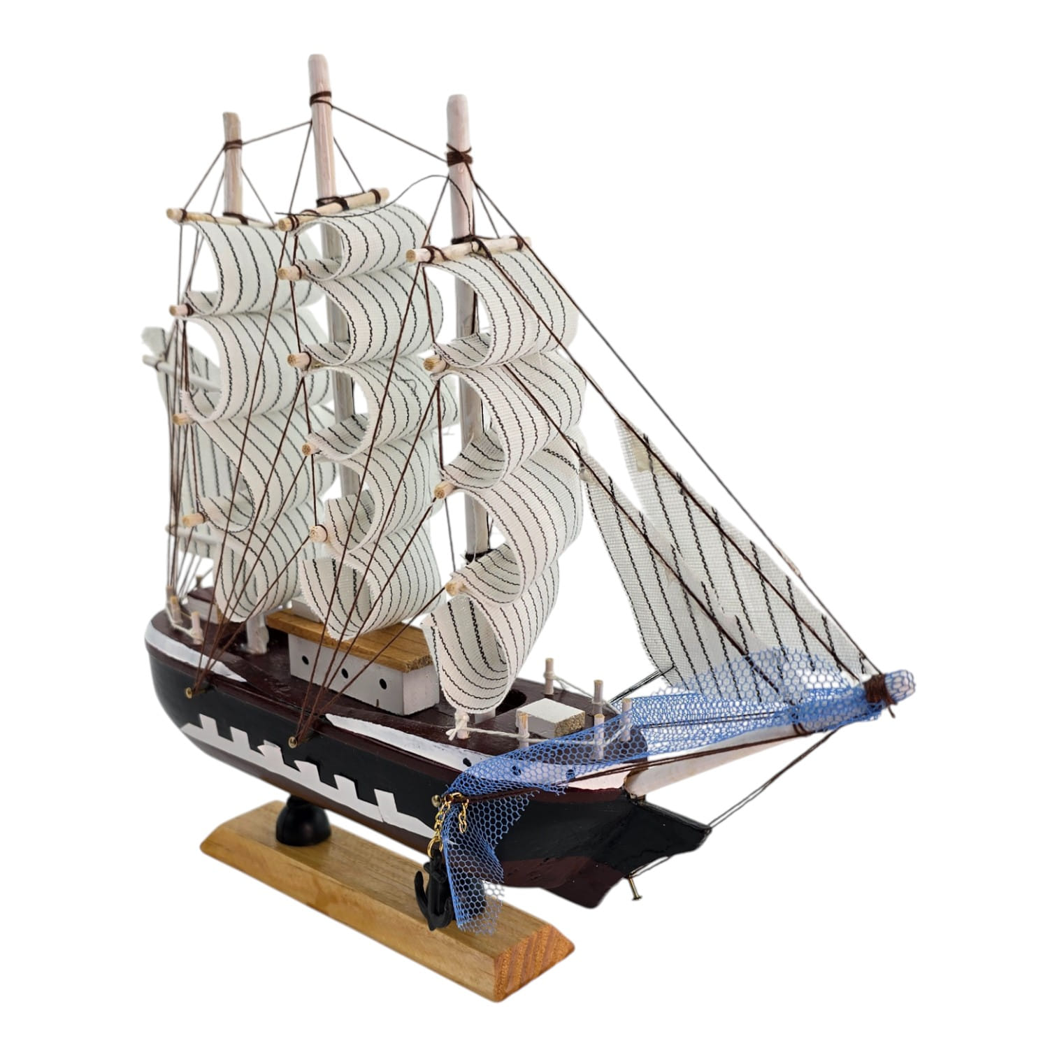 Настольная модель парусного корабля в естественных деревянных тонах с контрастными белыми парусами. Деревянный корпус и мачты, тканевые паруса и шнуровый такелаж создают выразительный морской акцент для полки, камина или рабочего стола. Отличный подарок любителям морской тематики и стильный элемент интерьера.