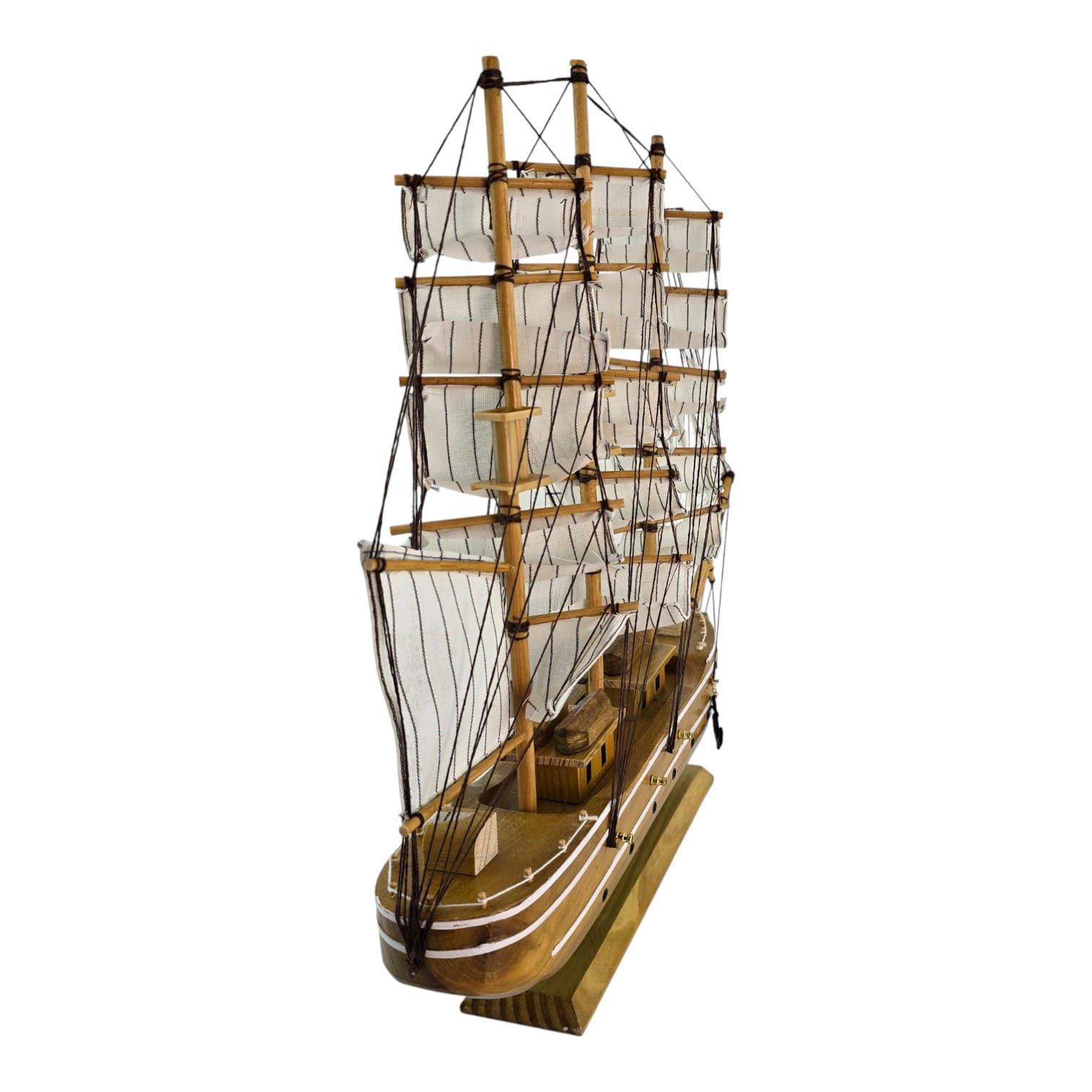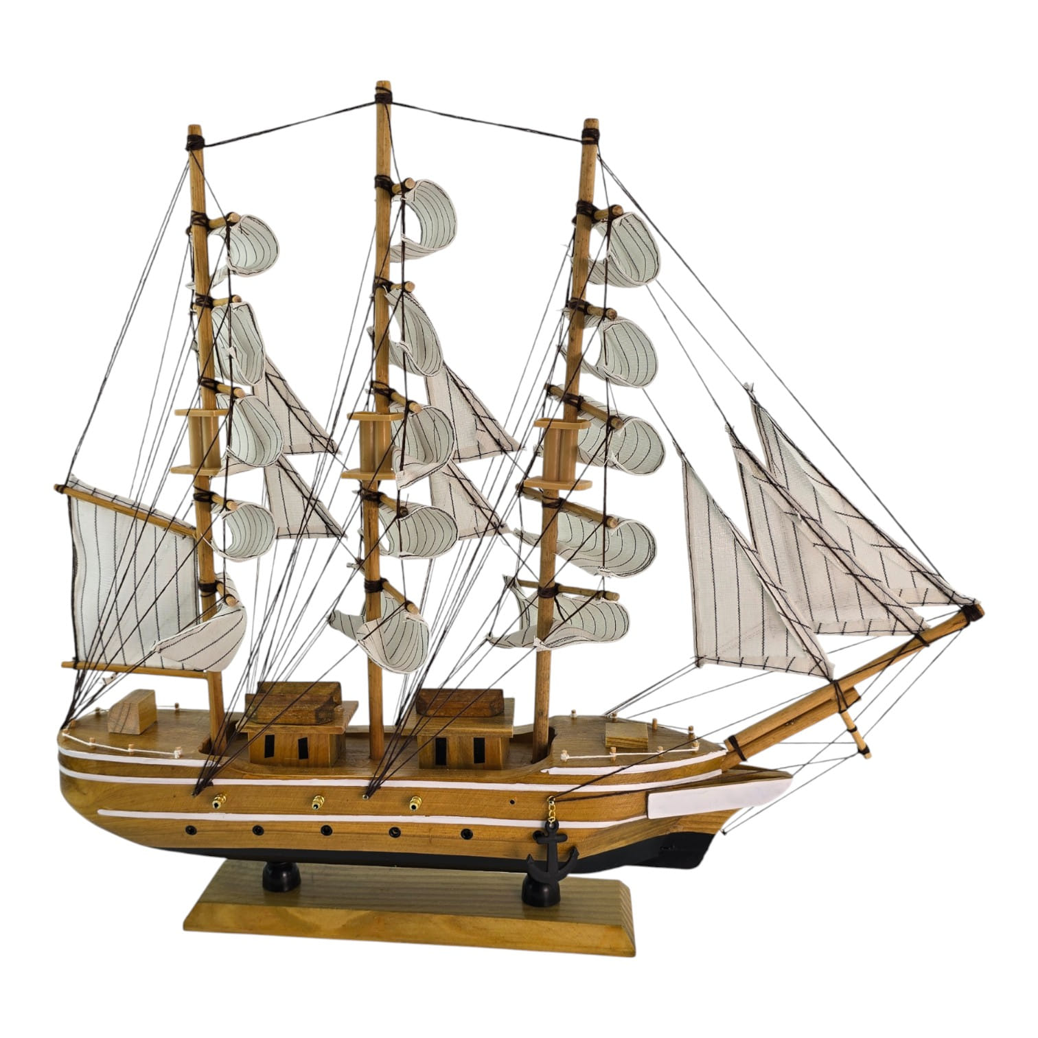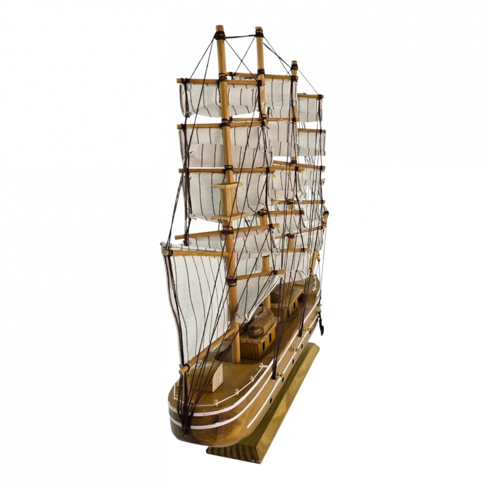Крупная настольная модель парусника с белыми парусами - эффектный акцент для кабинета, гостиной или детской. Корабль выполнен из дерева с тканевыми парусами и установлен на подставке, поэтому его удобно разместить на полке или рабочем столе. Отличный подарок любителям моря, путешествий и истории флота; придаёт интерьеру ощущение приключений и свободы.