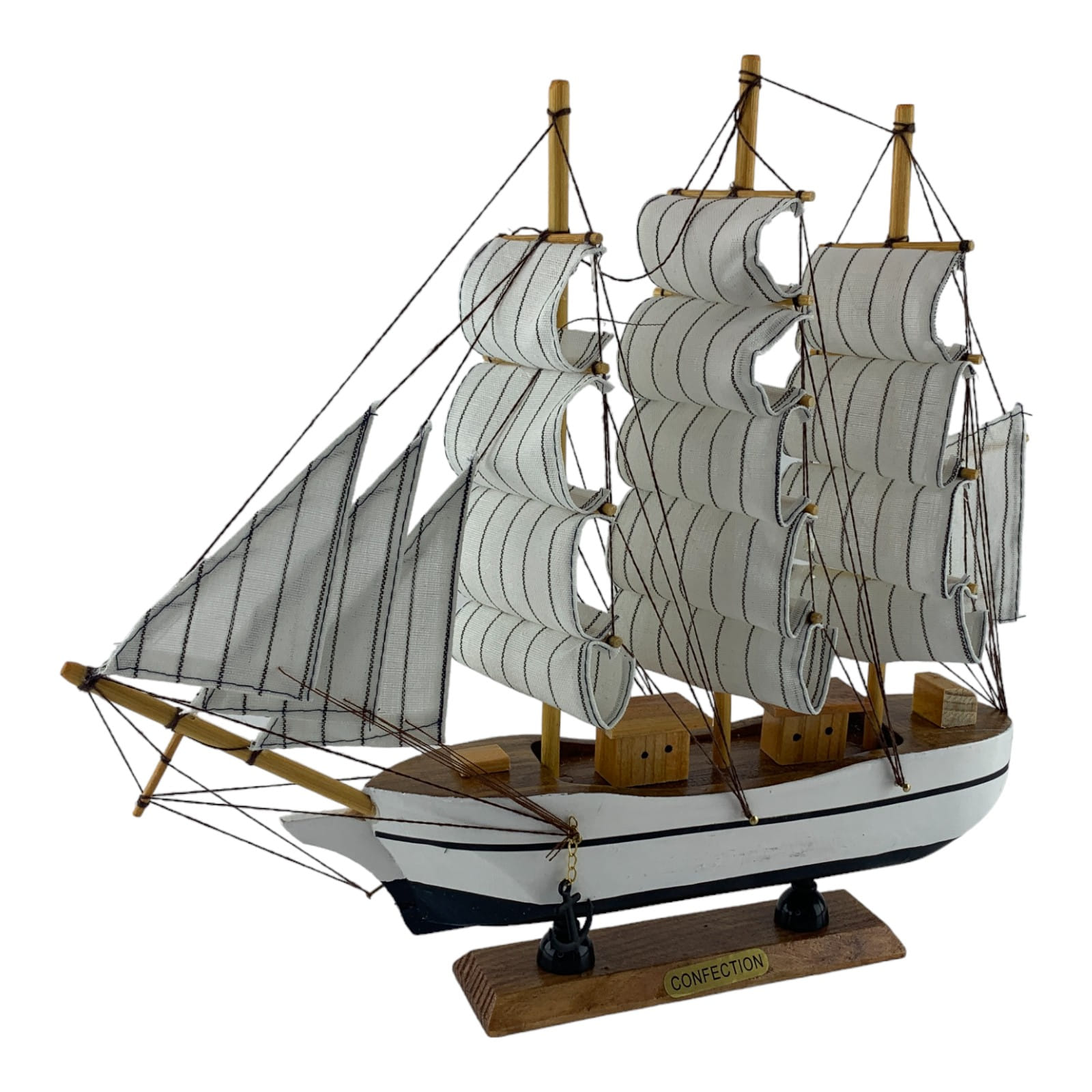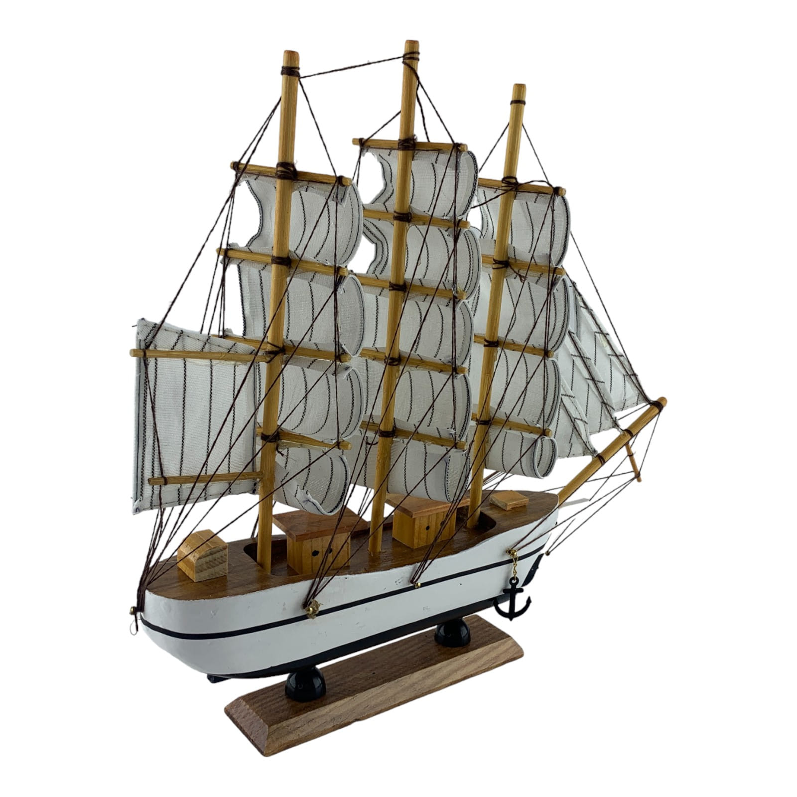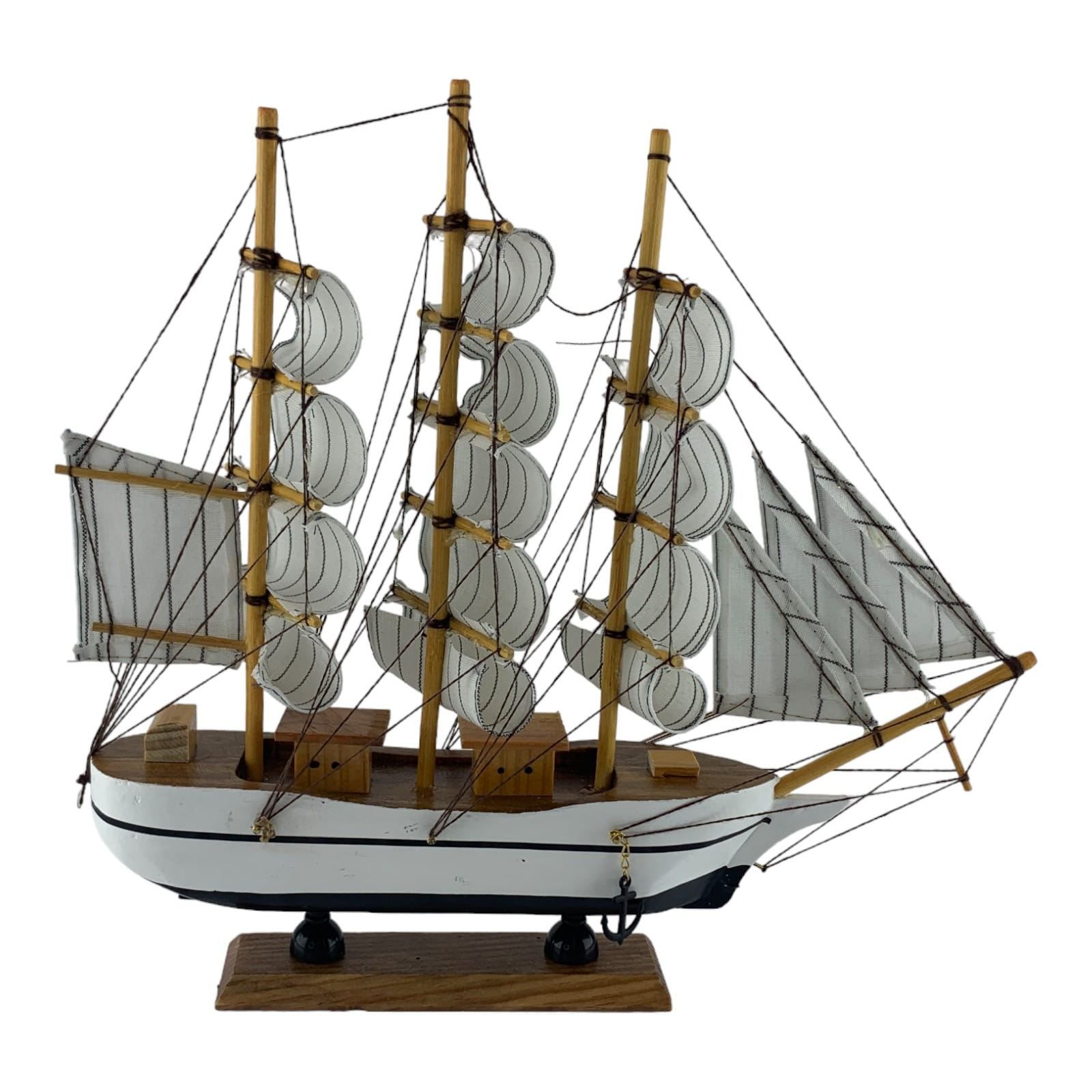 Деревянный парусник на подставке. Этот элегантный парусник - настоящий символ свободы и мечты о далеких морских путешествиях. Белого цвета с черной полосой и черный снизу , со светлыми парусами призывает к новым горизонтам и приключениям. Парусник на подставке станет не только изысканным элементом вашего интерьера, но и напоминанием о бескрайних океанах и незабываемых моментах. Его компактные размеры делают его идеальным для размещения на столе, полке или в другом уголке вашего дома. Два якоря придают этой композиции дополнительный морской шарм и символизируют стабильность и верность своим идеалам. Этот парусник также может стать замечательным подарком для всех, кто разделяет страсть к морским темам и мечтает о приключениях на широких водах. Он символизирует свободу, мечты и бесконечные возможности. Погрузитесь в мир морской романтики с нашим парусником. Он будет напоминать вам о великих путешествиях и дарить вдохновение каждый день.
