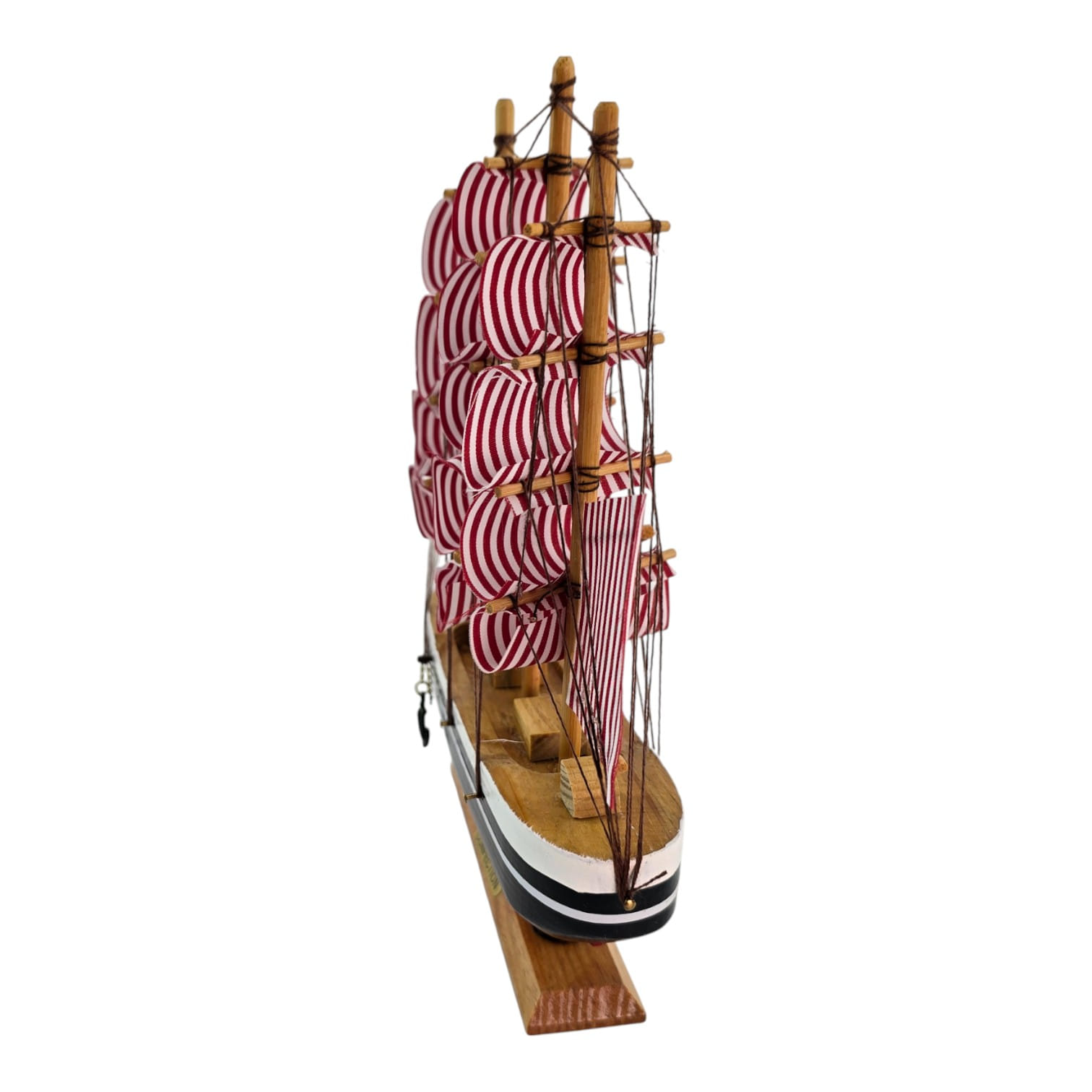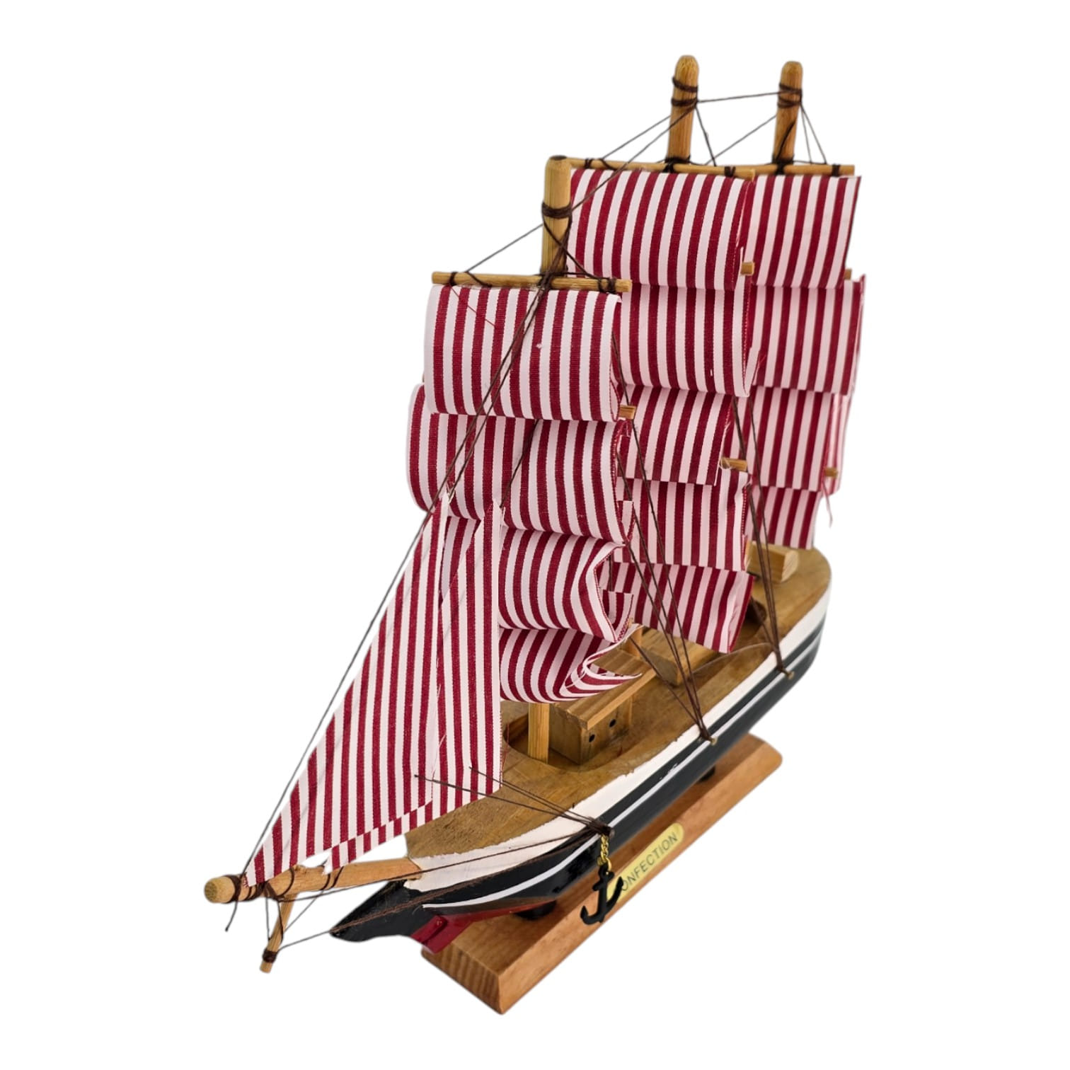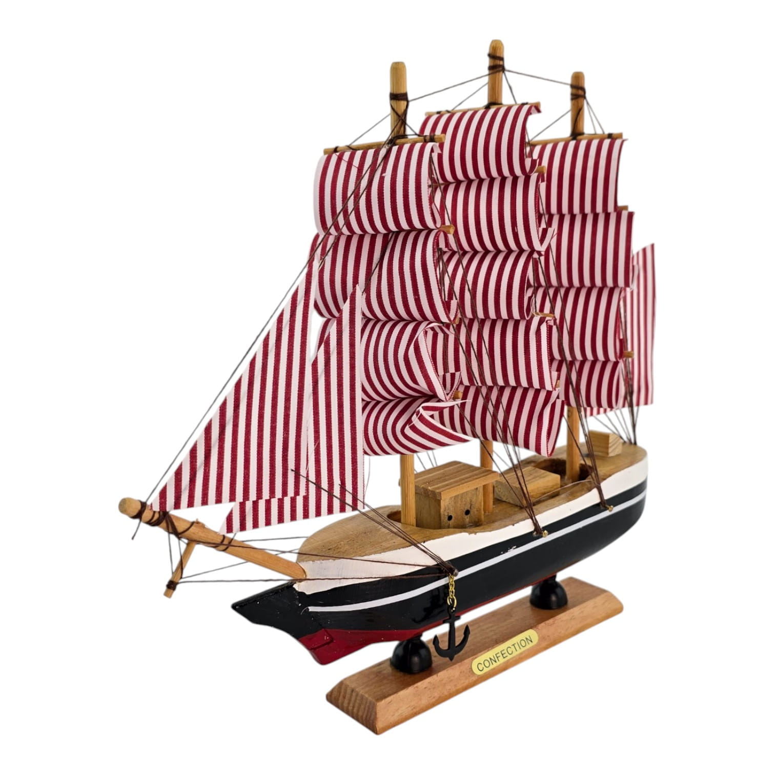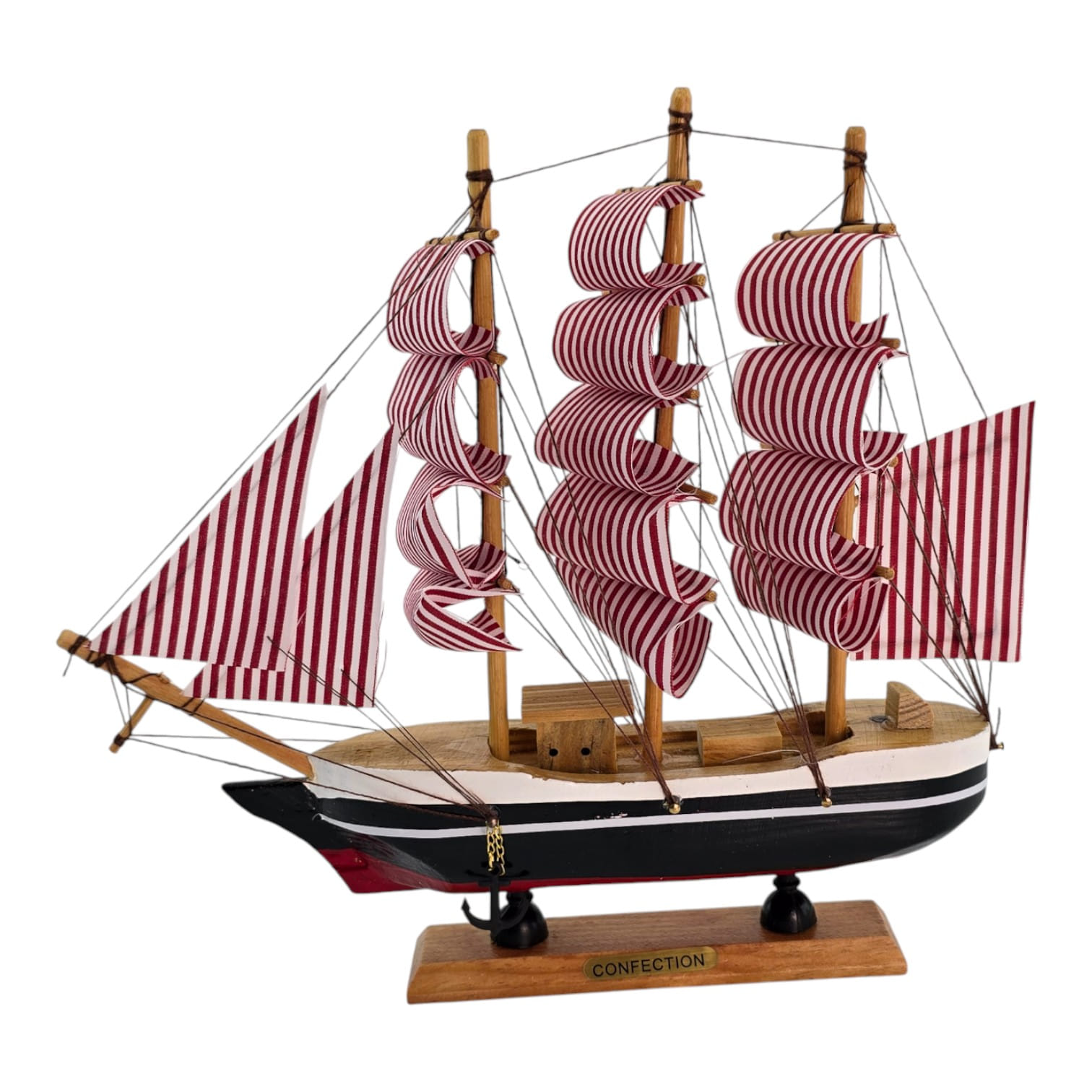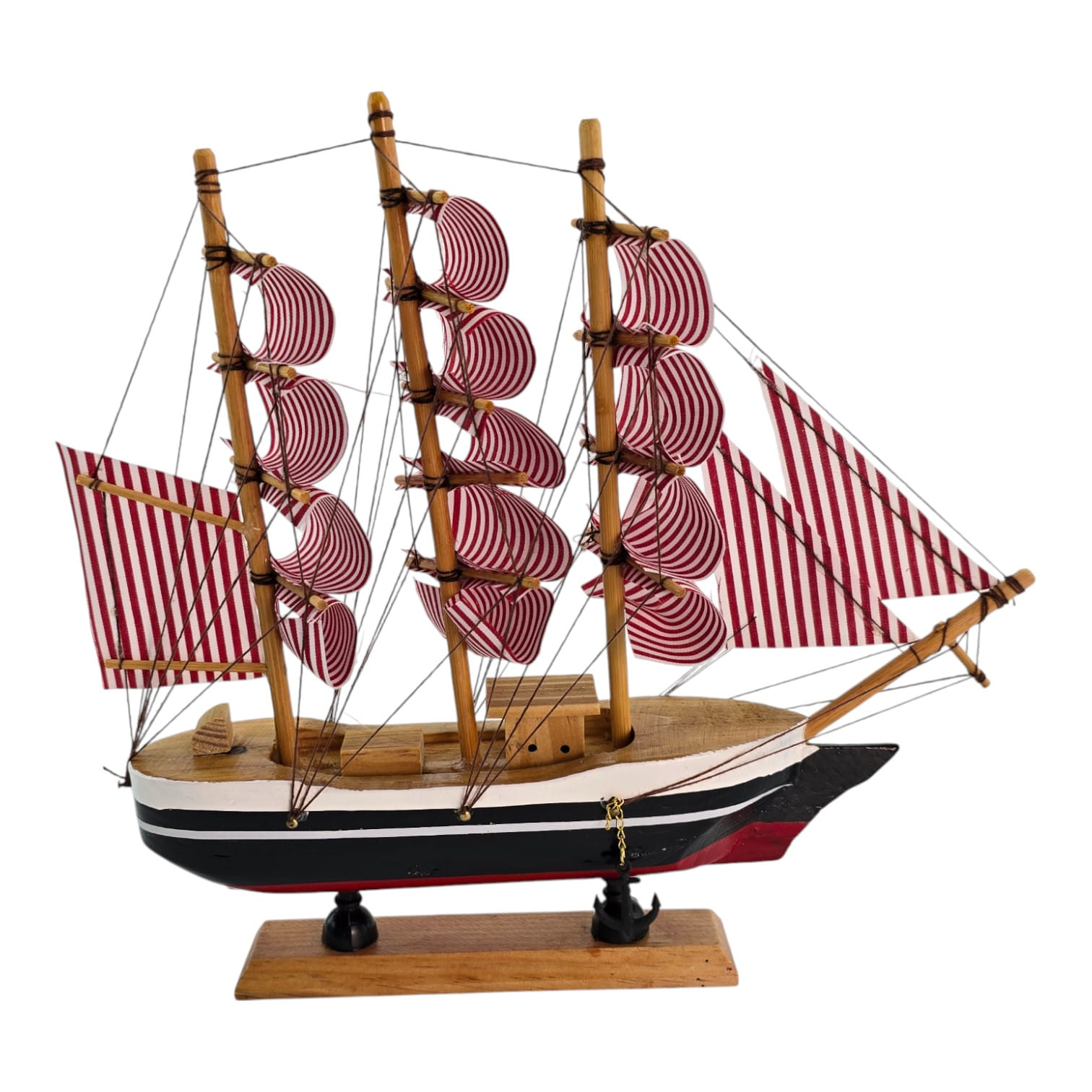 Настольная модель парусного корабля в красно-белой гамме. Деревянный корпус и мачты, тканевые паруса и шнуровый такелаж создают выразительный морской акцент для полки, камина или рабочего стола. Отличный подарок любителям морской тематики и стильный элемент интерьера.