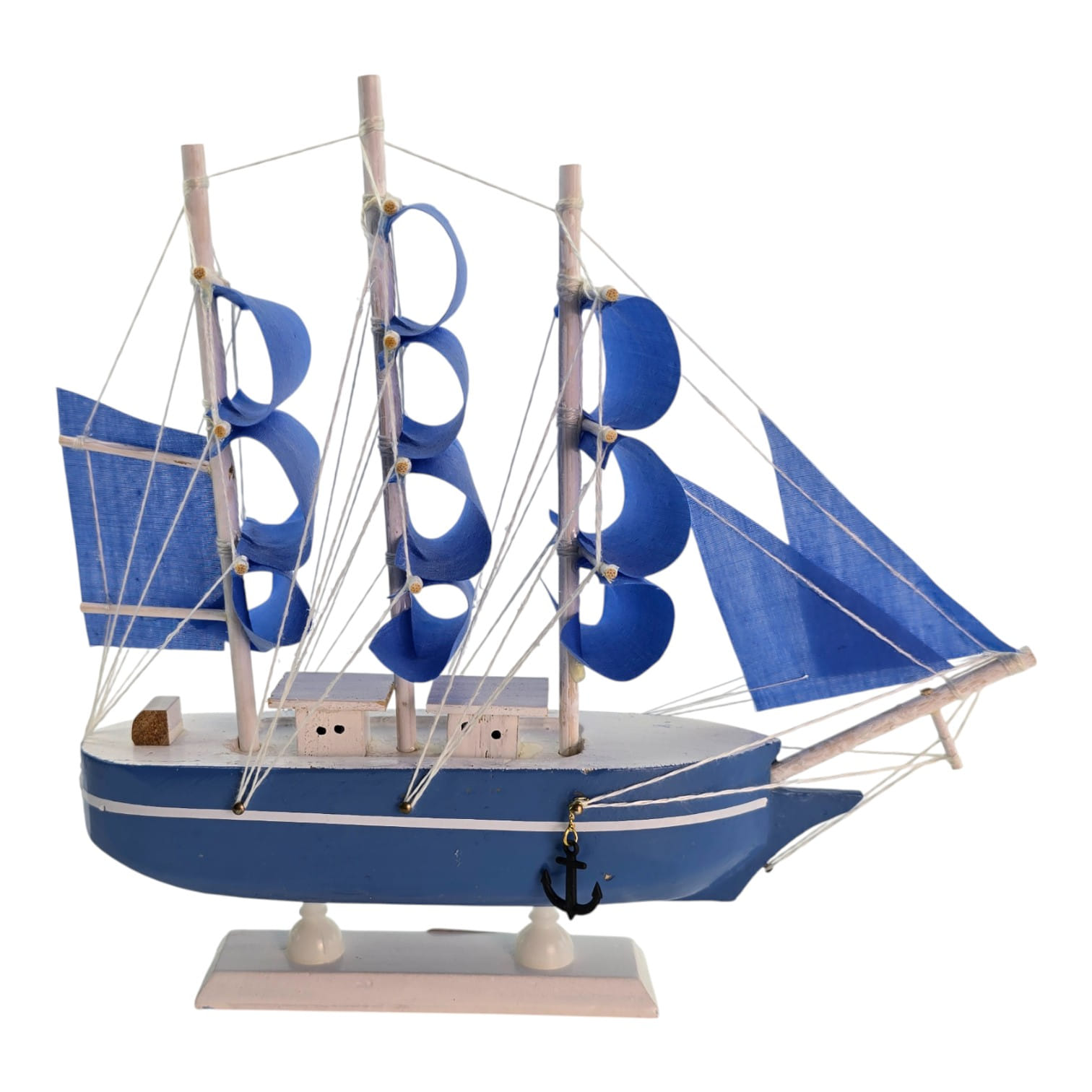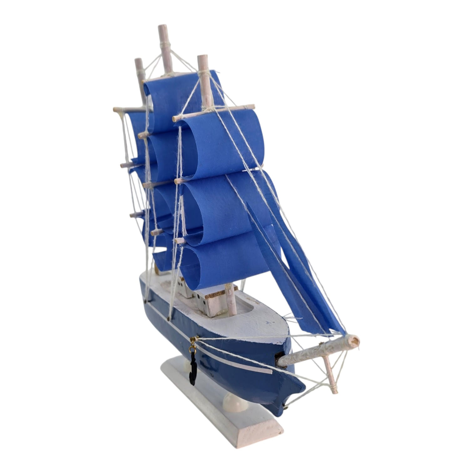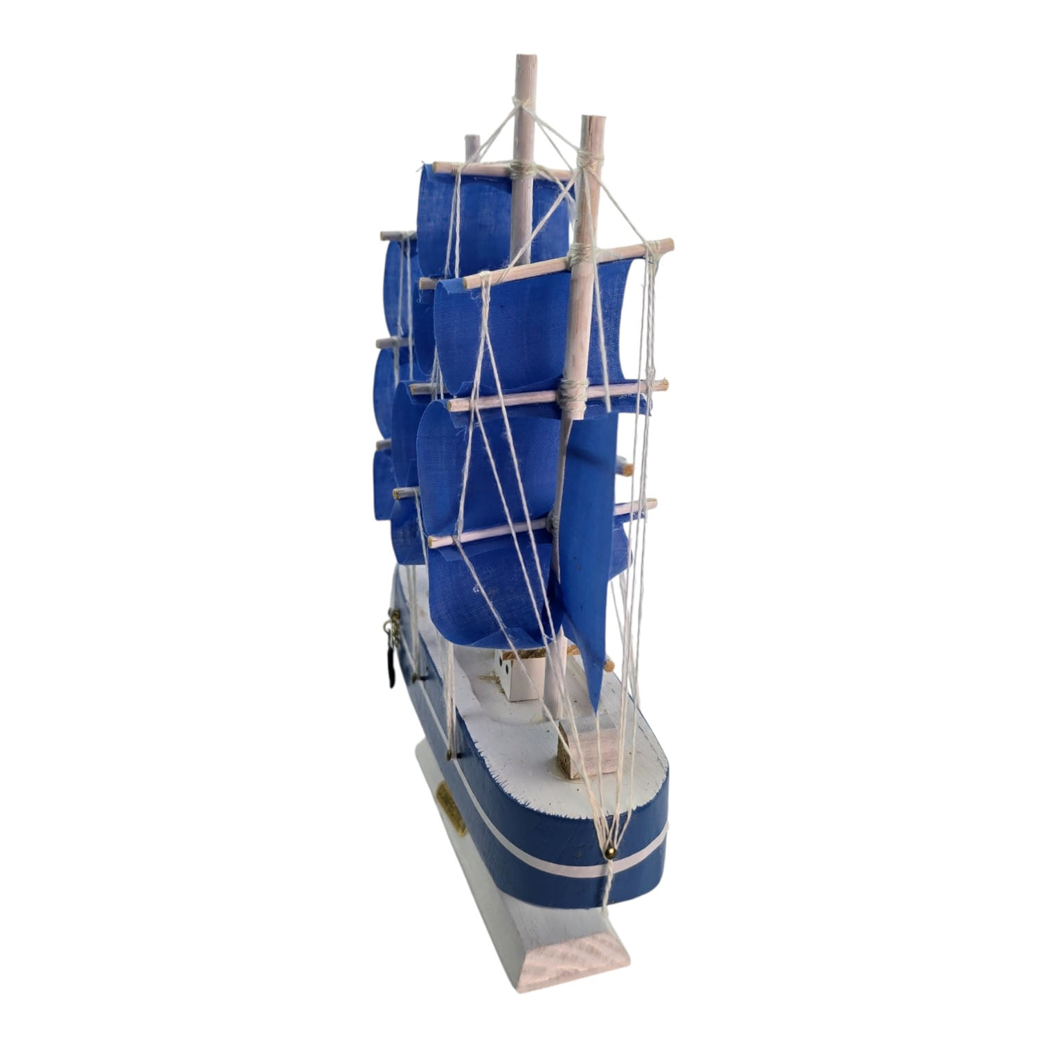 Настольная модель парусного корабля в сине-белой гамме. Деревянный корпус и мачты, тканевые паруса и шнуровый такелаж создают выразительный морской акцент для полки, камина или рабочего стола. Отличный подарок любителям морской тематики и стильный элемент интерьера.
