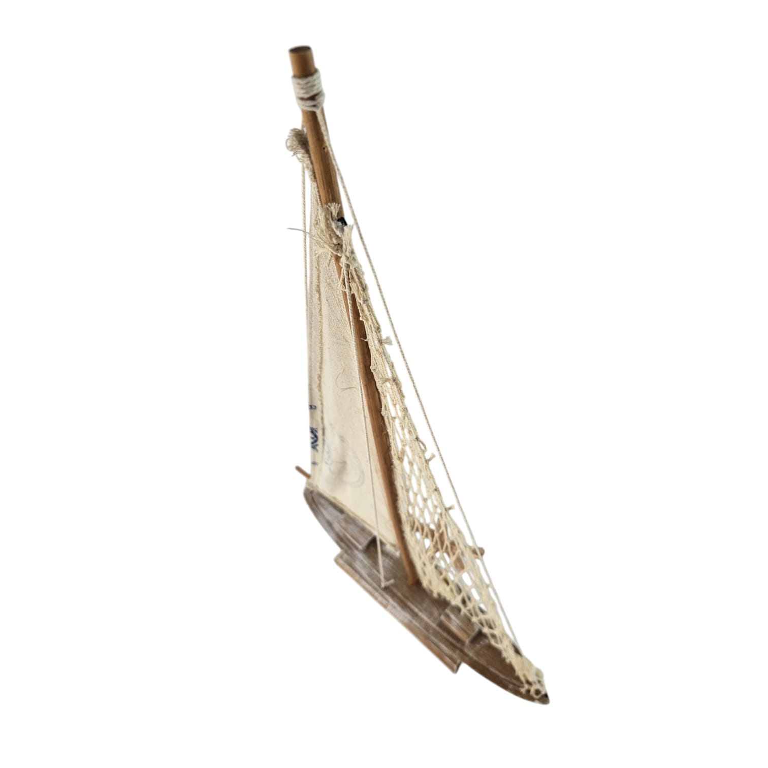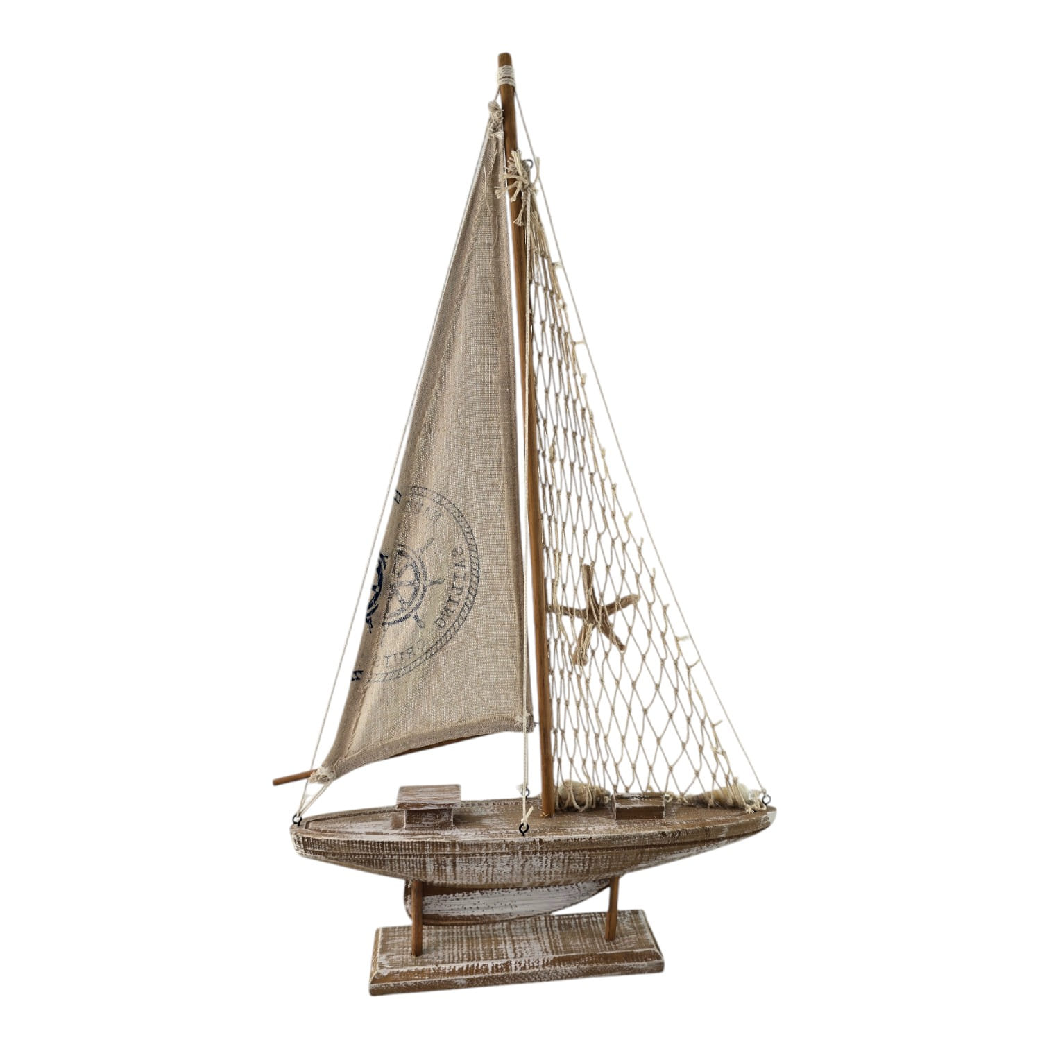 Особенности: Высокая деревянная модель яхты с парусом, декоративной сеткой, украшенная настоящими ракушками и морской звездой. Отлично подходит для украшения интерьера и создания морской атмосферы.