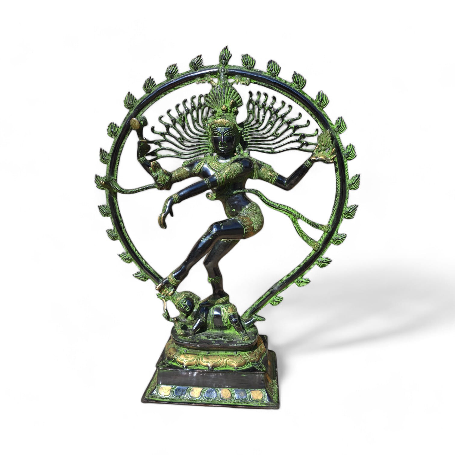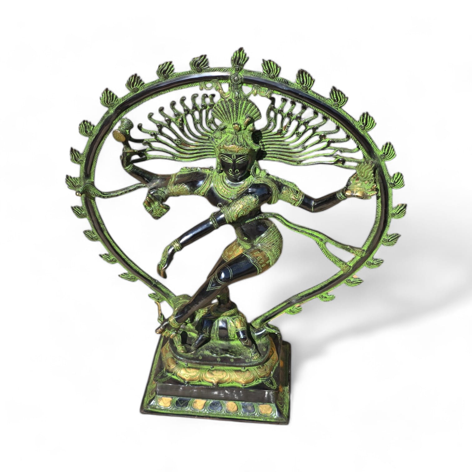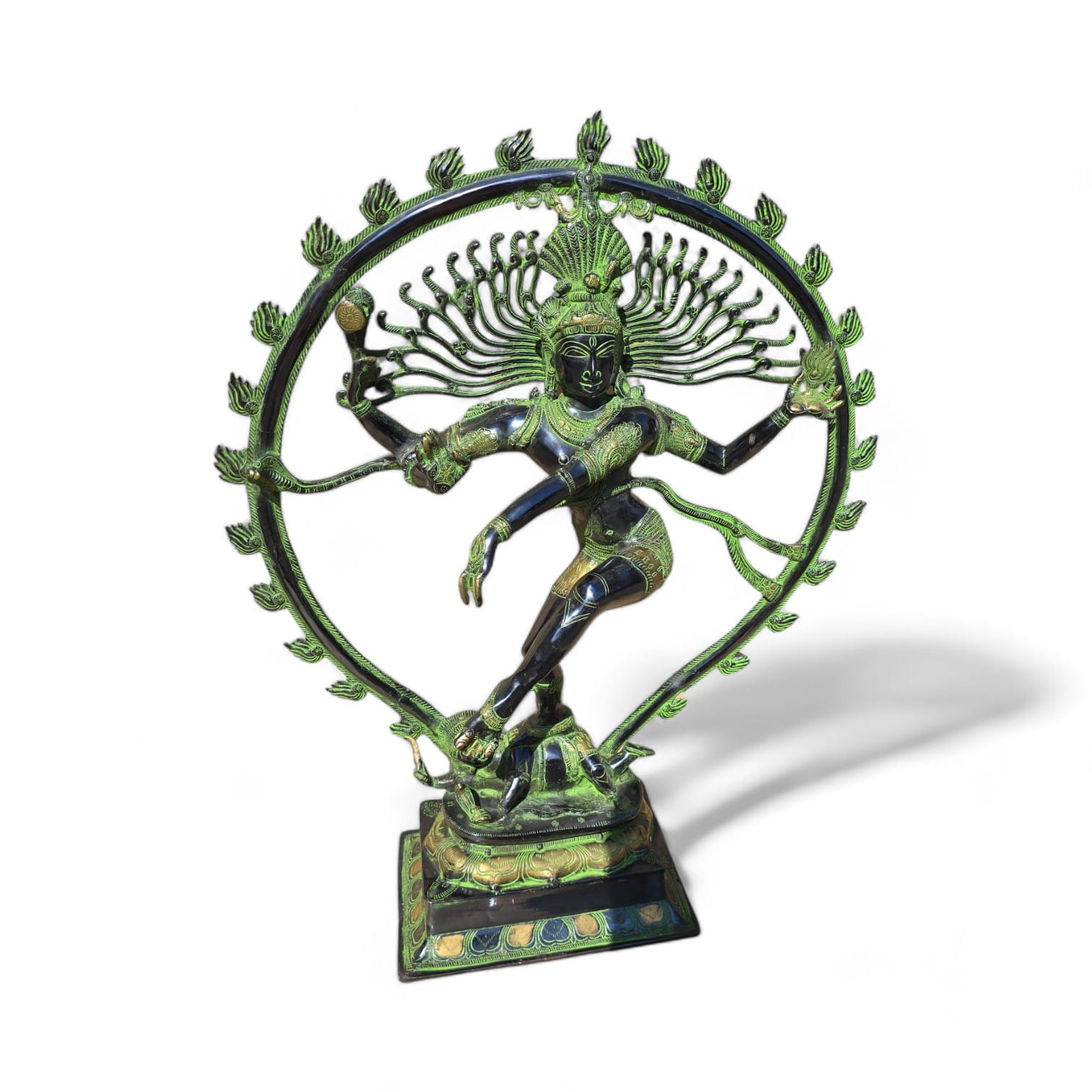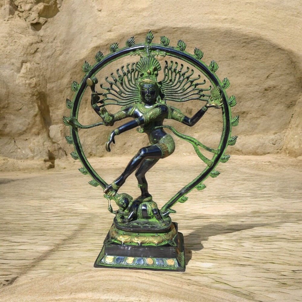 Представляем вашему вниманию величественную бронзовую статуэтку "Танцующий Шива", выполненную мастерами из Индии. Эта статуэтка изображает бога Шиву в его танцующей форме, также известной как Шива Натараджа. Шива, исполняющий космический танец, символизирует циклы созидания и разрушения во Вселенной, а также непрерывное обновление и баланс.