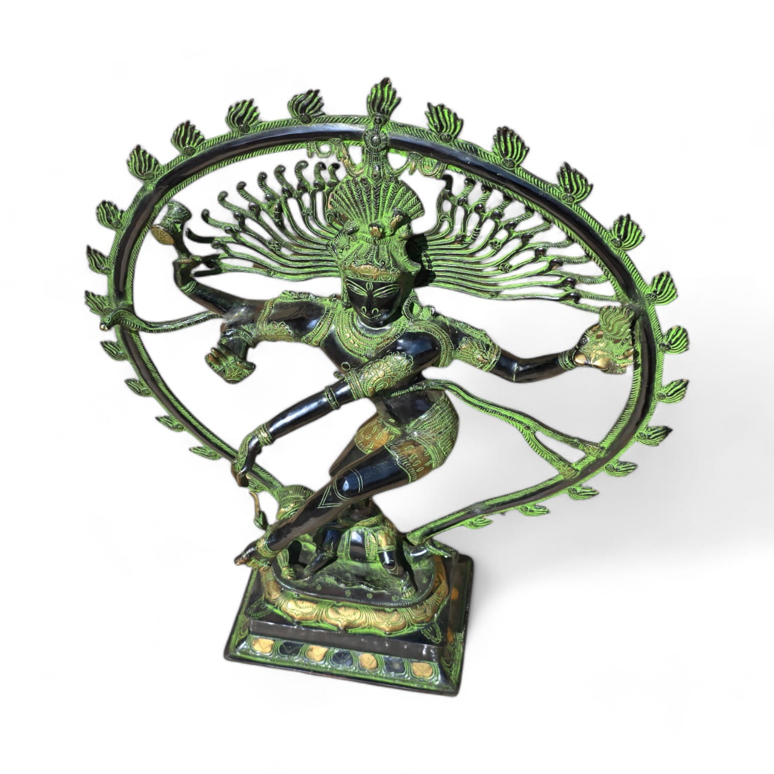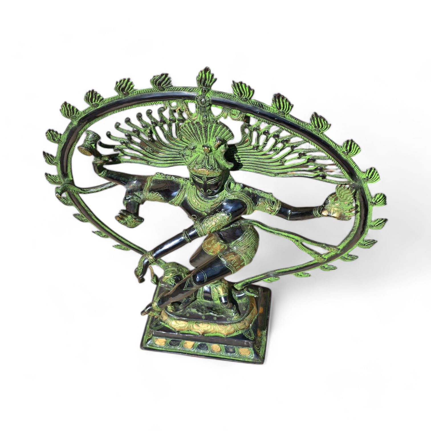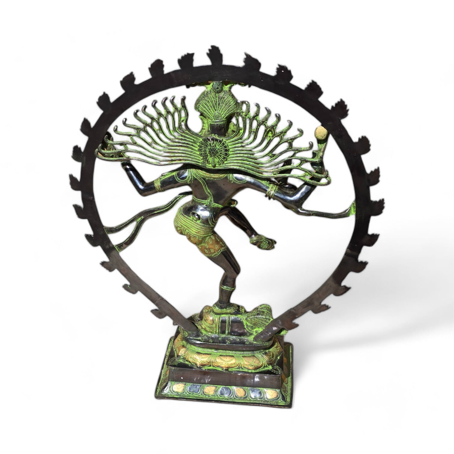 Представляем вашему вниманию величественную бронзовую статуэтку "Танцующий Шива", выполненную мастерами из Индии. Эта статуэтка изображает бога Шиву в его танцующей форме, также известной как Шива Натараджа. Шива, исполняющий космический танец, символизирует циклы созидания и разрушения во Вселенной, а также непрерывное обновление и баланс.