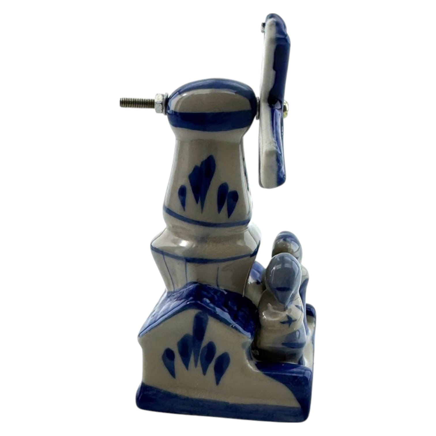Эта изящная керамическая мельница — настоящий символ уюта и романтики. Выполненная в классической сине-белой гамме, она украшена трогательной сценой с парой в традиционной одежде, создающей атмосферу деревенского спокойствия и тепла. Ветряные лопасти вращаются, придавая композиции живость и динамику.