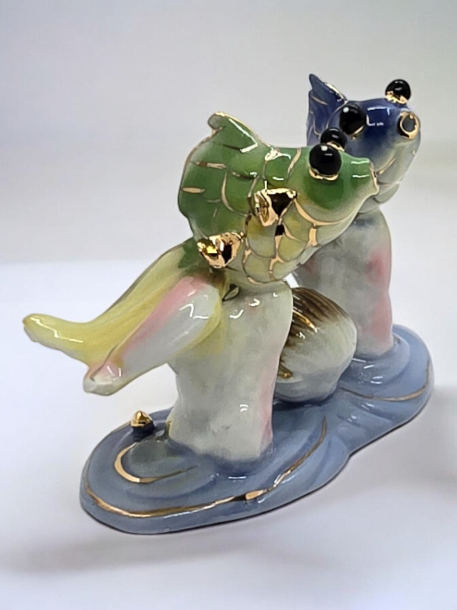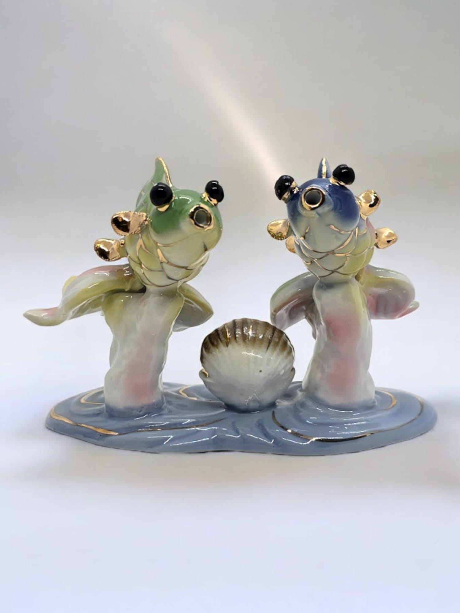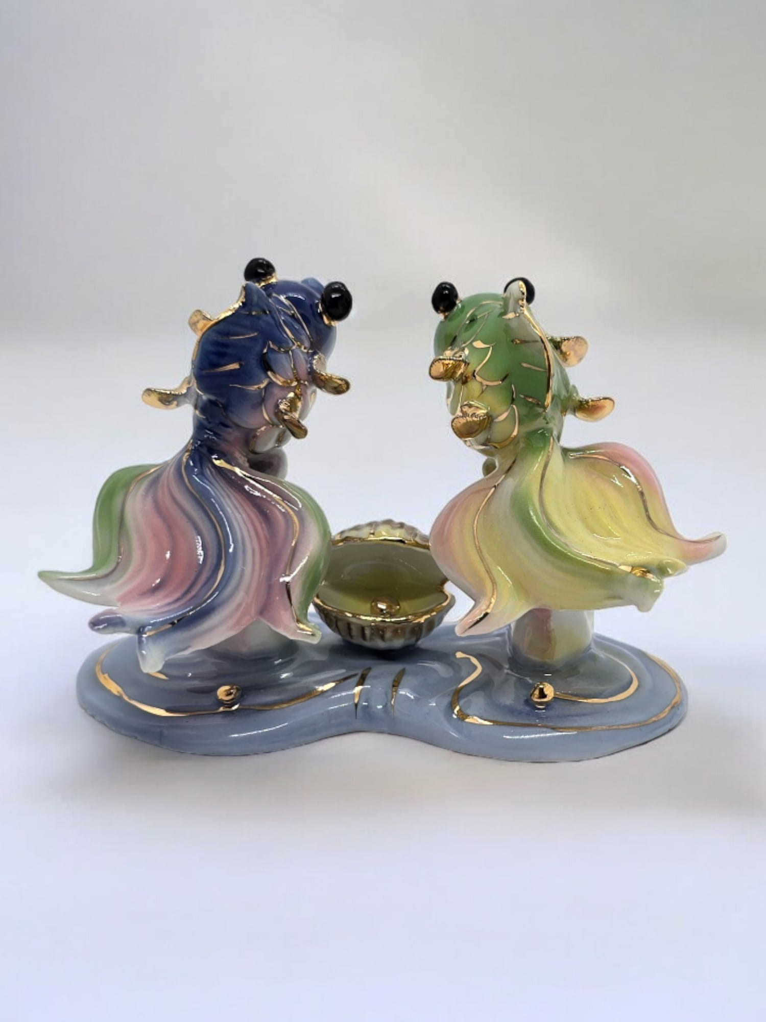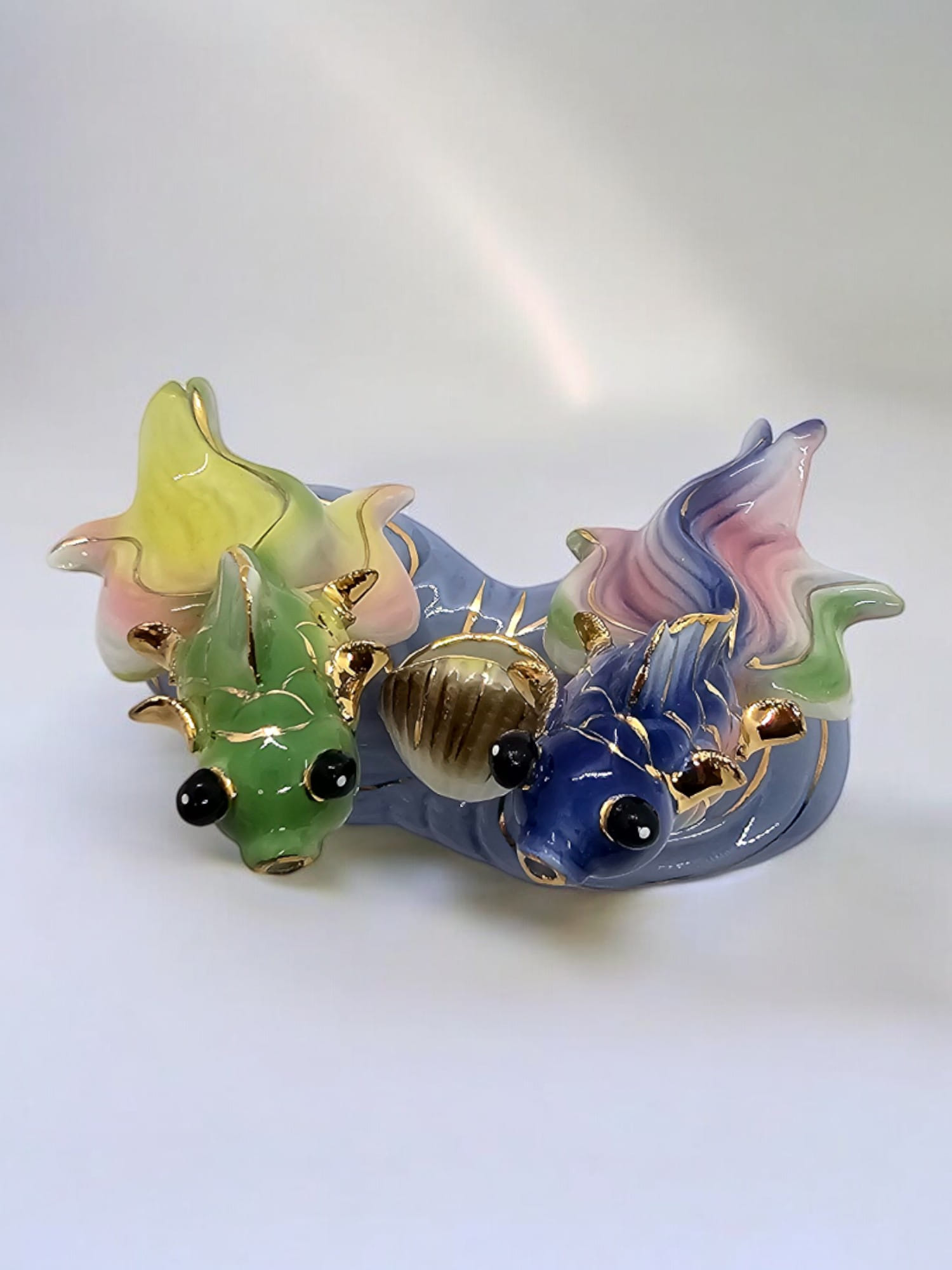 Эта изящная статуэтка имеет пастельные оттенки зеленого, синего и розового цветов, которые плавно переходят друг в друга, придавая ей особый шарм и элегантность. Золотистые акценты на рыбках подчеркивают их красоту и утонченность.