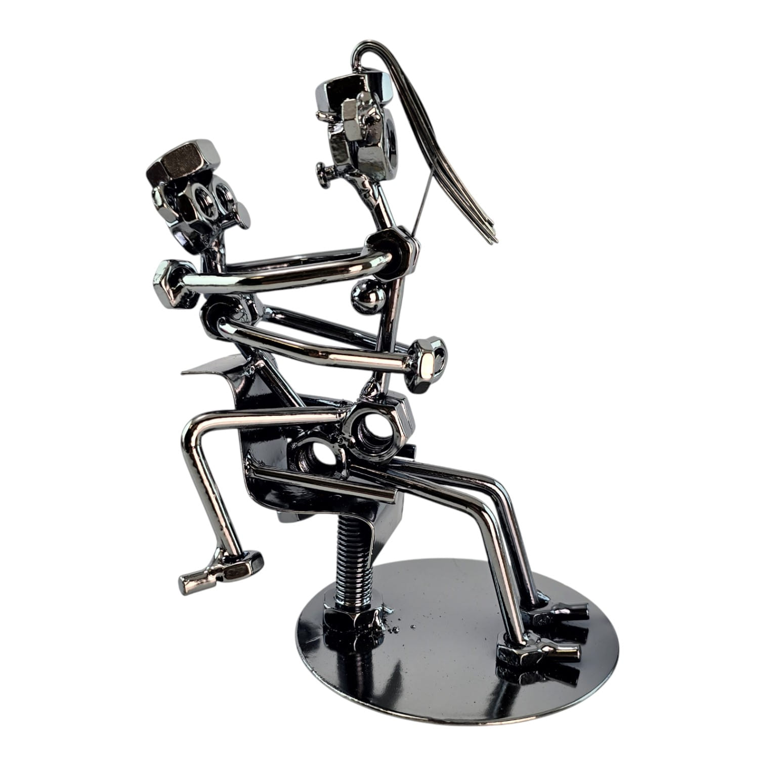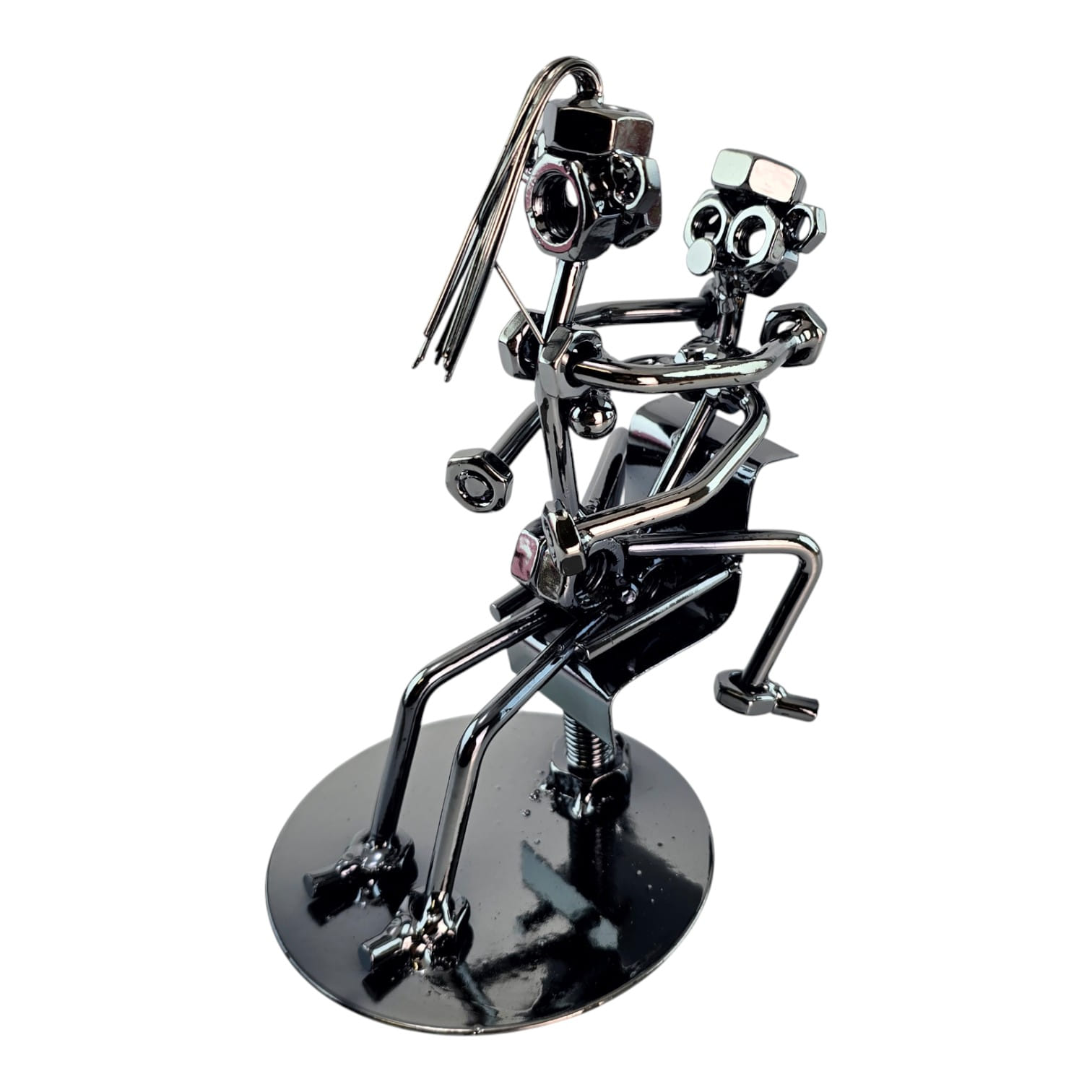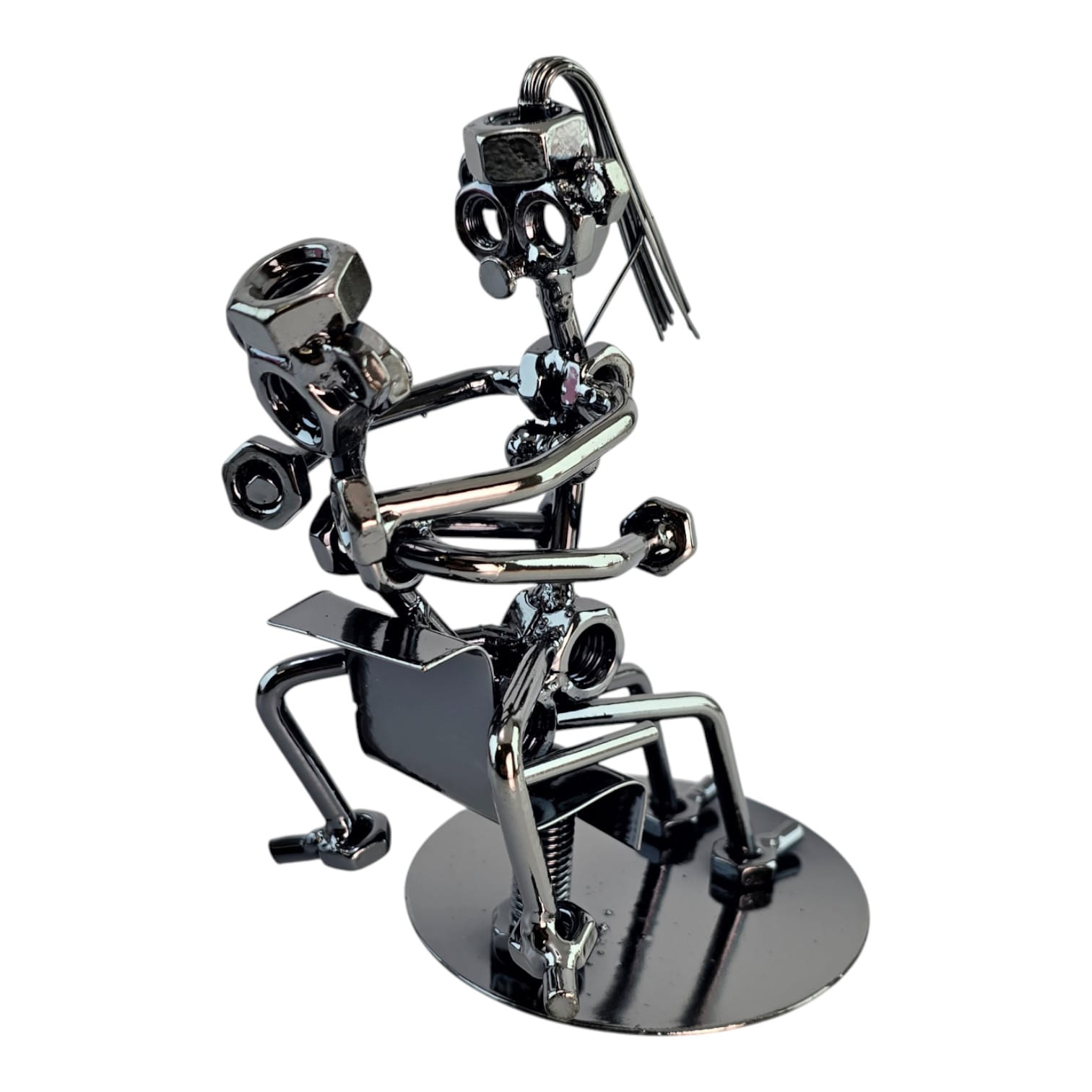 Арт-скульптура из металла в индустриальном стиле, изображающая романтичную пару в объятиях на стуле. Собранная из «гайок и болтов», она привлекает внимание и добавляет характер интерьеру. Отличный акцент для стола, полки или витрины; уместный нестандартный подарок для пары, друга, коллеги, владельца барбершопа или кофейни. Тяжёлая база позволяет использовать как оригинальный пресс-папье.