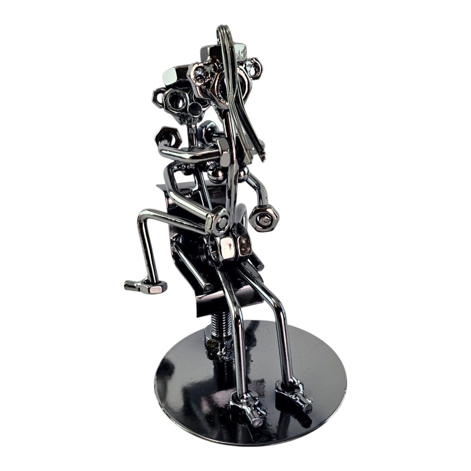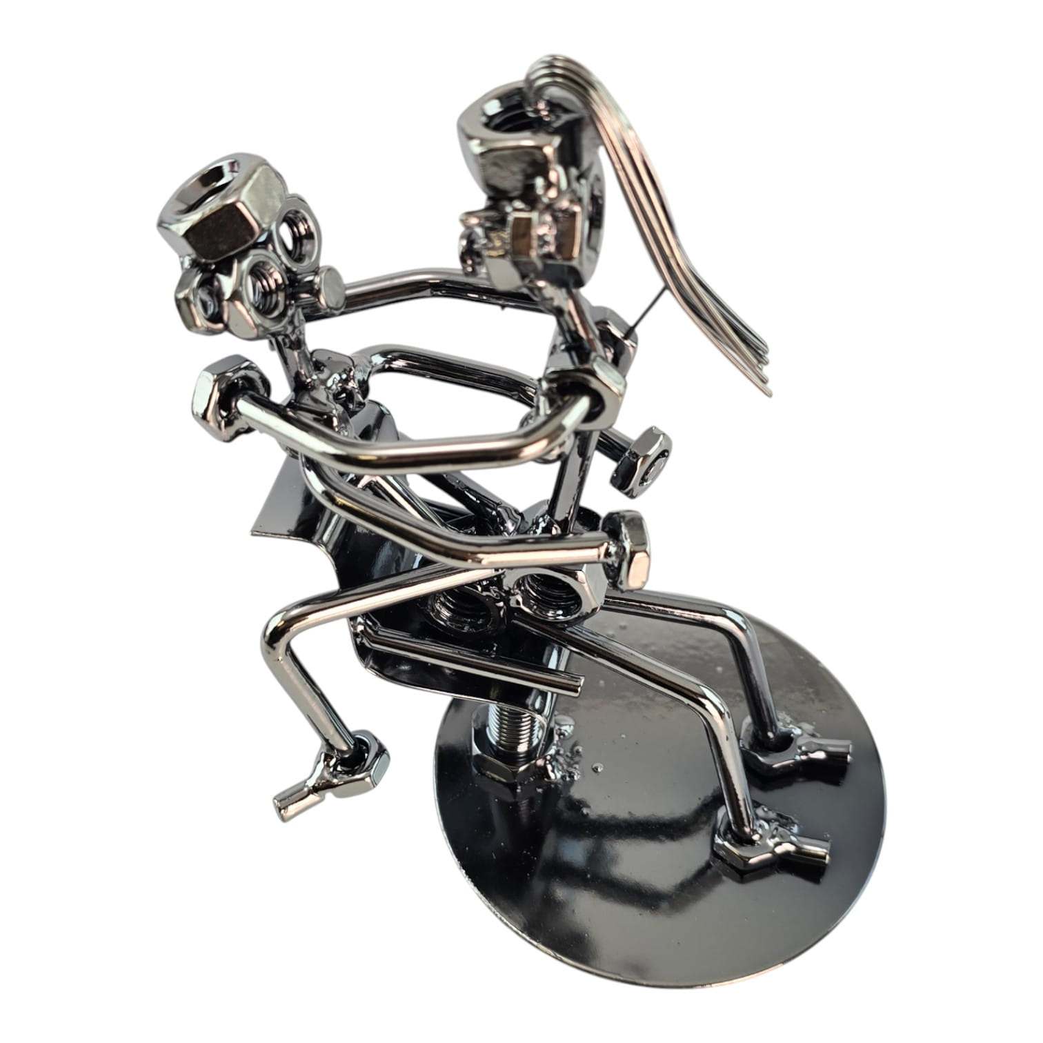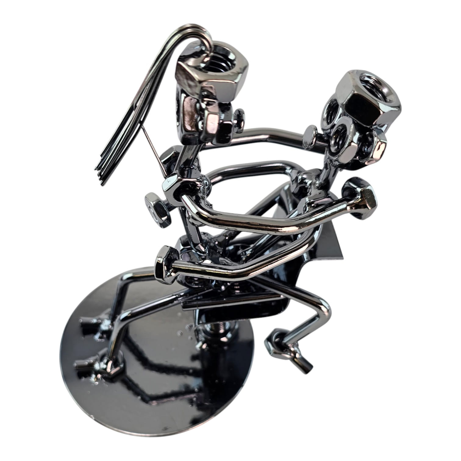 Арт-скульптура из металла в индустриальном стиле, изображающая романтичную пару в объятиях на стуле. Собранная из «гайок и болтов», она привлекает внимание и добавляет характер интерьеру. Отличный акцент для стола, полки или витрины; уместный нестандартный подарок для пары, друга, коллеги, владельца барбершопа или кофейни. Тяжёлая база позволяет использовать как оригинальный пресс-папье.
