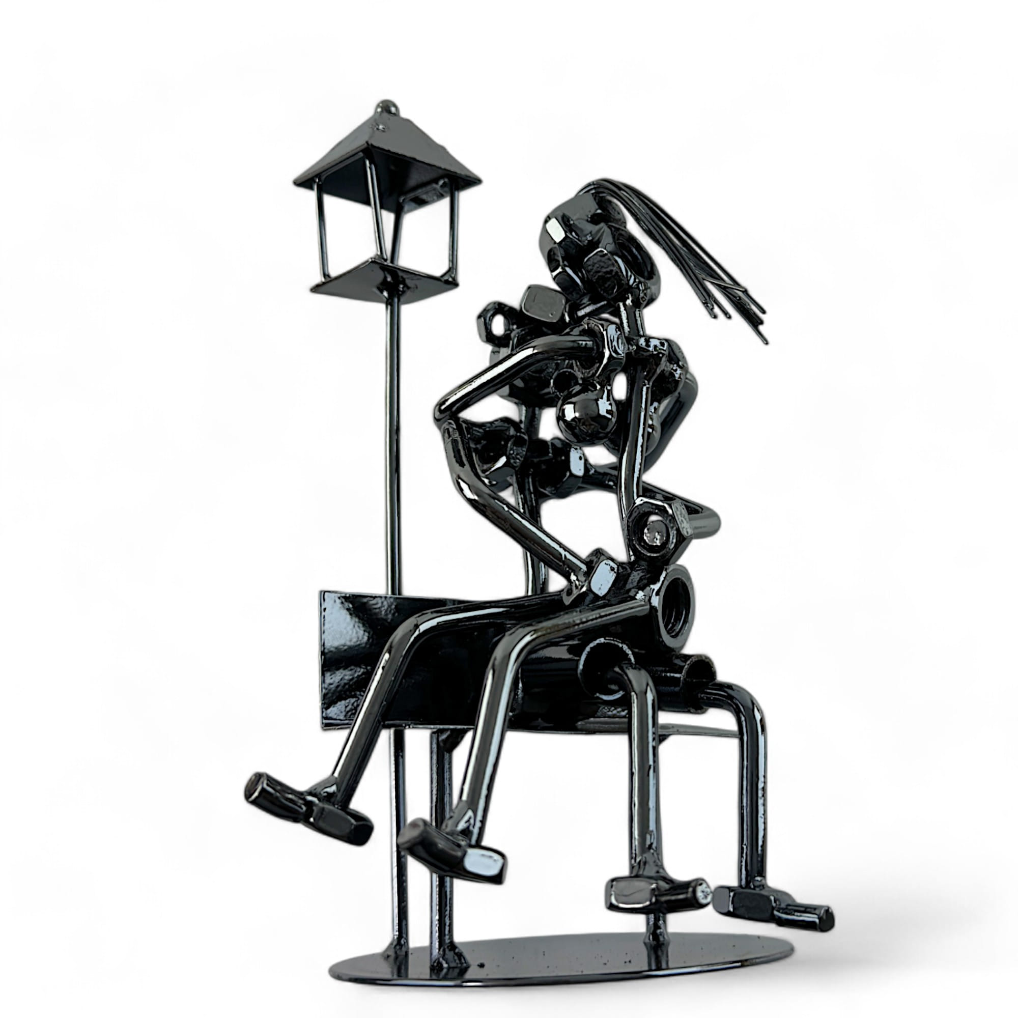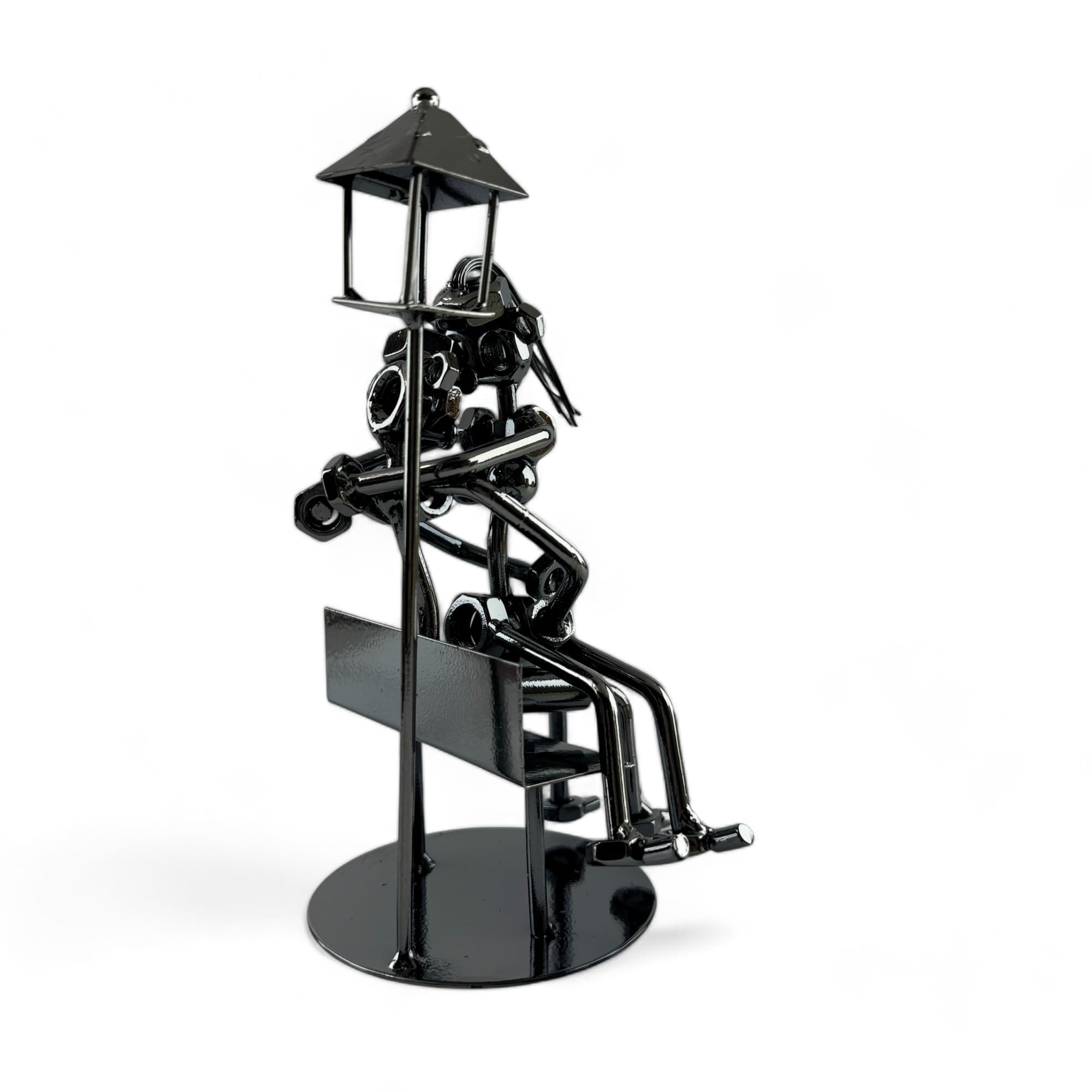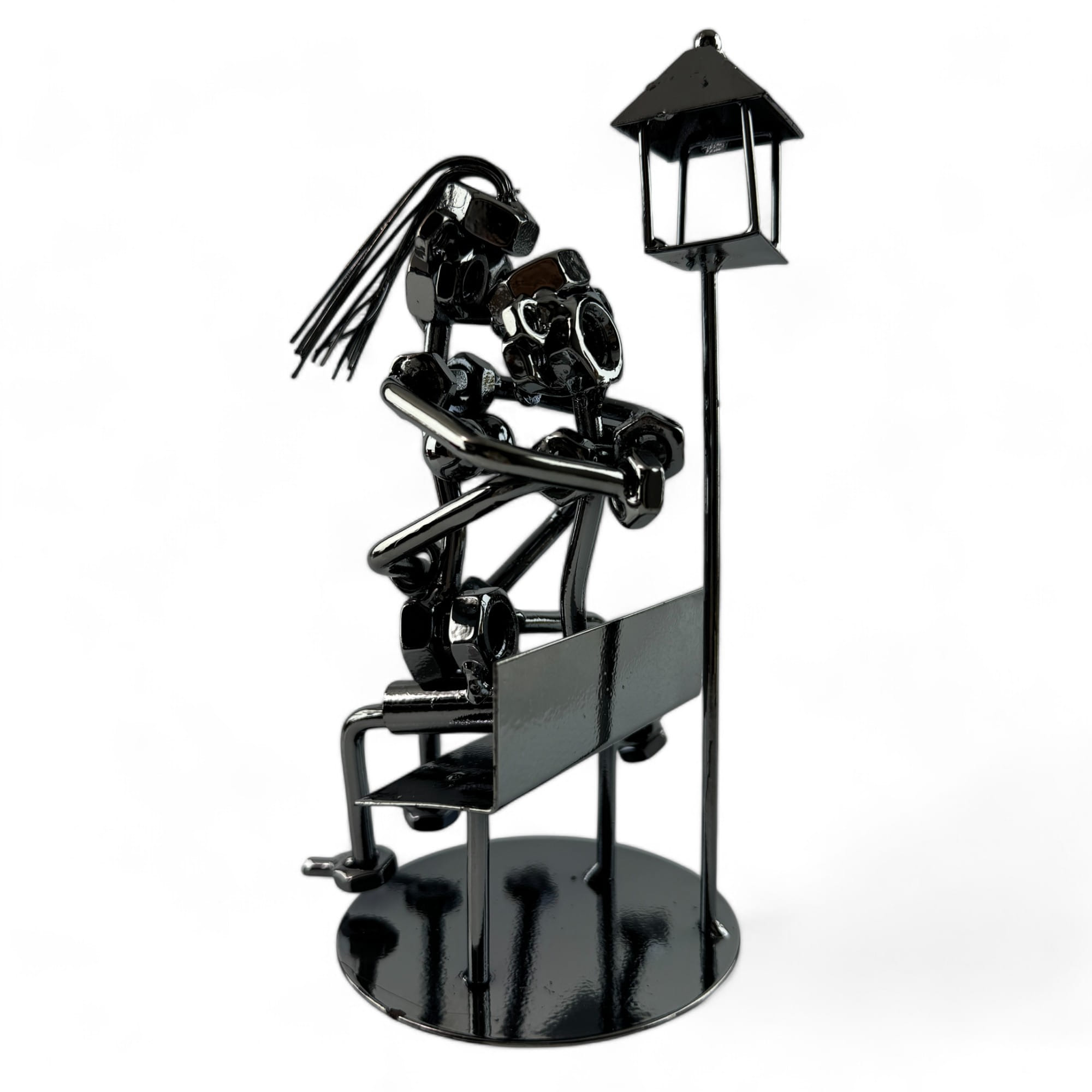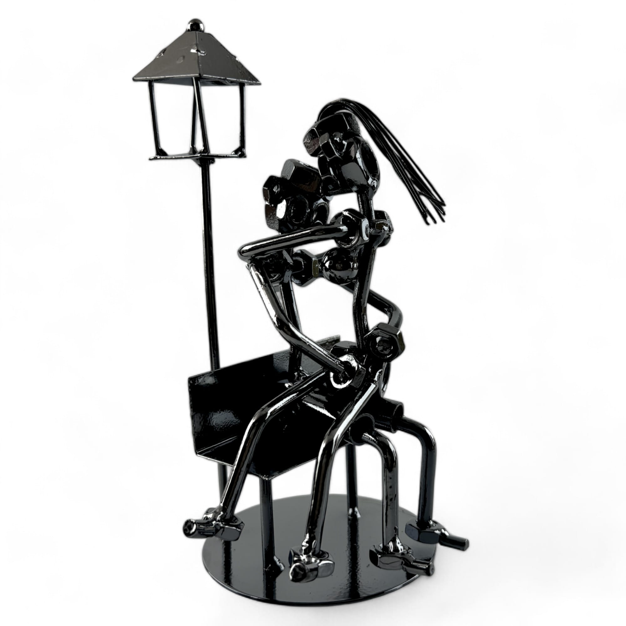Статуэтка "Техно арт Влюбленные" — оригинальный и необычный арт-объект, который станет ярким акцентом вашего интерьера. Выполненная в стиле техно-арта, эта статуэтка изображает влюбленную пару, сидящую на скамейке под фонарем. Каждый элемент композиции создан из металлических деталей, таких как гайки, болты и пружины, что придает изделию индустриальный и современный вид.