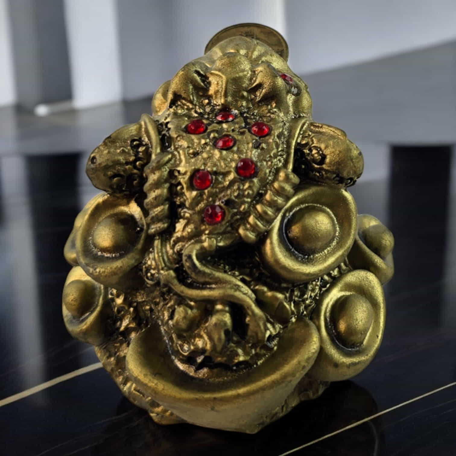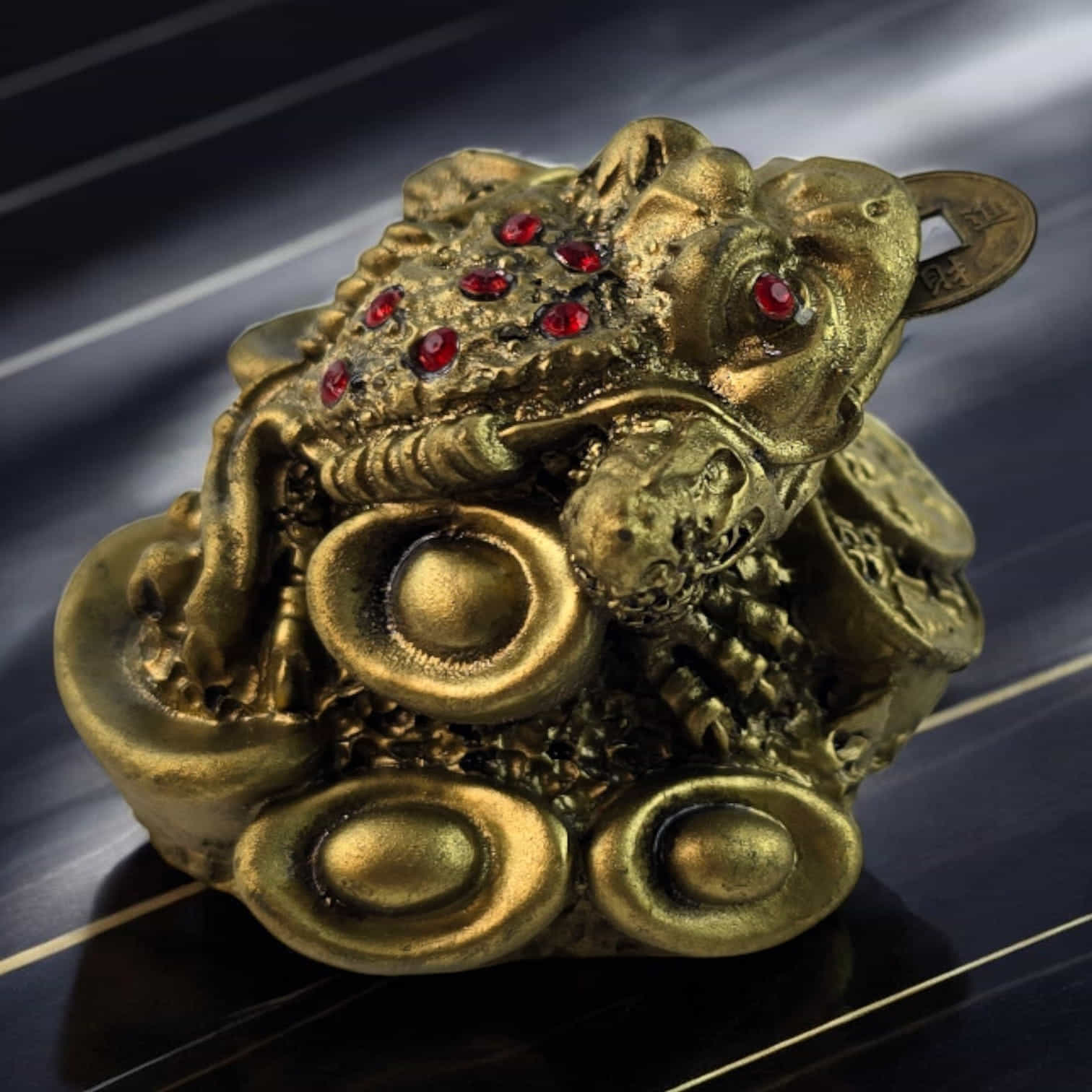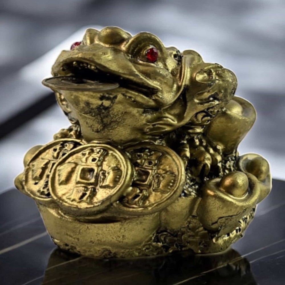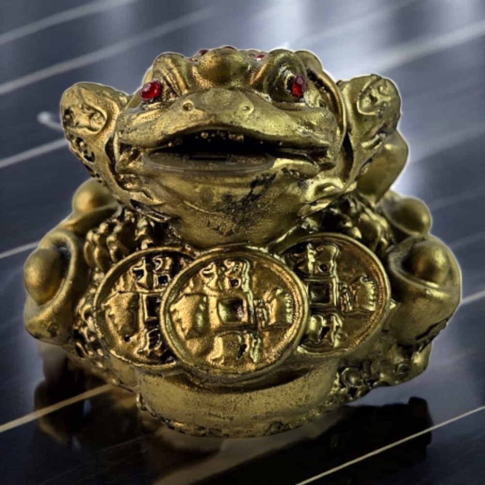Эта декоративная фигурка жабы на монетах является символом финансового благополучия и успеха. Она выполнена из полимера, с покрытием, имитирующим бронзу. Глаза жабы украшены красными камешками, что подчёркивает её эстетическую привлекательность и создаёт впечатление силы и магии.
