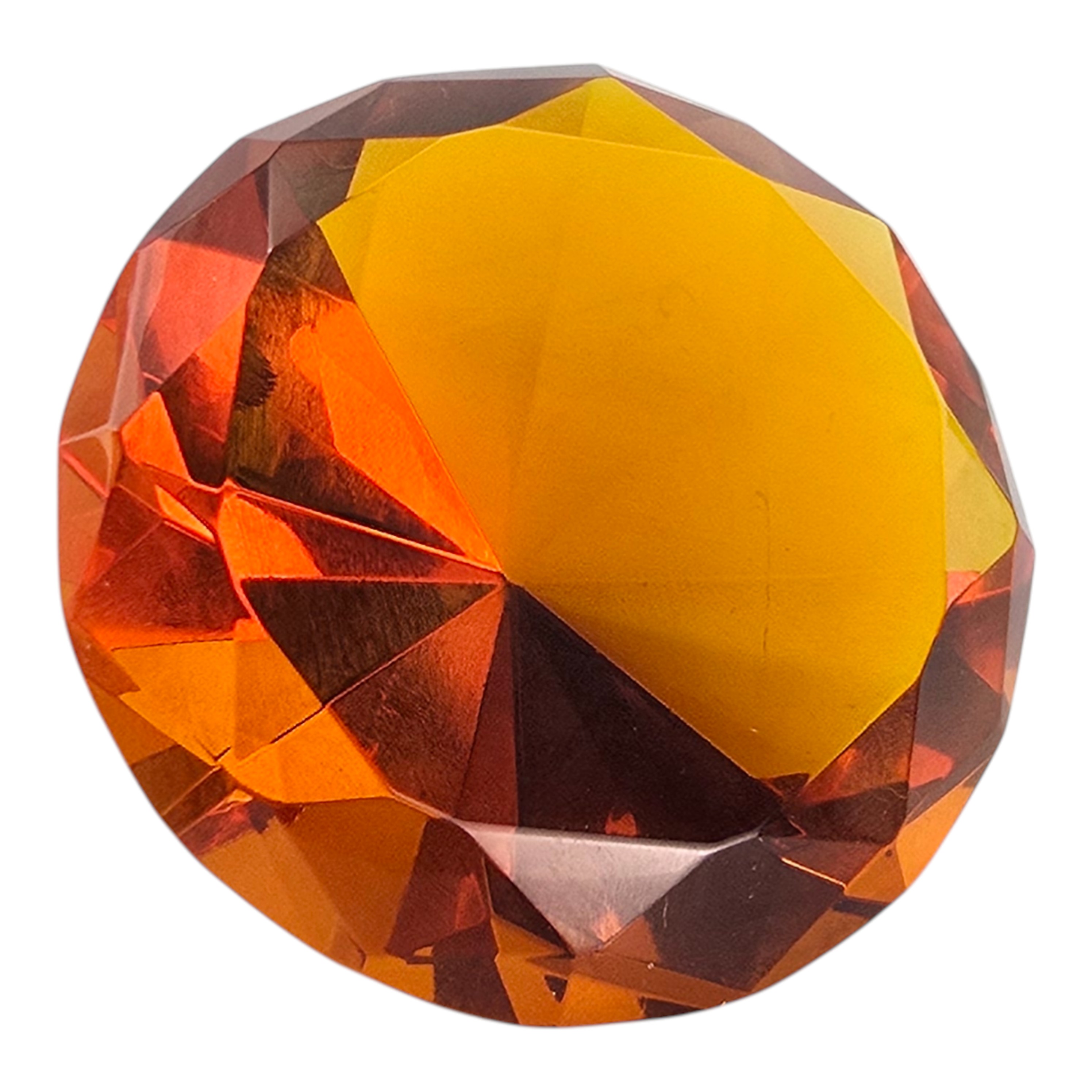 Добавьте тепла, уюта и роскоши вашим фотографиям или интерьеру с нашим крупным декоративным кристаллом насыщенного янтарного (оранжевого) цвета. Благодаря классической огранке в форме бриллианта, камень великолепно преломляет свет, создавая невероятно красивые золотистые блики.
