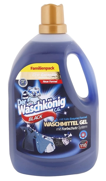 Пральний гель Der Waschkönig Black здатний видалити навіть найскладніші плями і бруд з тканин і в той же час захищає їх колір. Продукт проникає у волокна і створює спеціальний захисний бар'єр, залишаючи тканину м'якою і приємною на дотик. Волокна тканини згладжуються, що ускладнює подальше осадження бруду. Гель розчиняється у воді без будь-яких проблем навіть при низьких температурах. Це надає тканинам приємний запах. Гель для прання Der Waschkönig Black у своєму складі містить засоби для захисту пральної машини від корозії і скам'яніння.