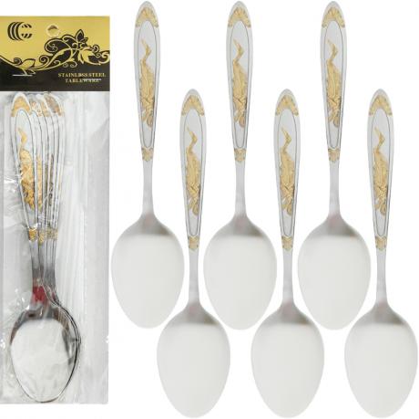 Набір столових ложок містить 6 шт. Довжина кожної ложки становить 21 см. Виготовлені з металу, що відповідає стандартам безпеки. Товщина сталі – 2 мм, що забезпечує міцність виробів. Ложки мають класичну форму та простий дизайн.