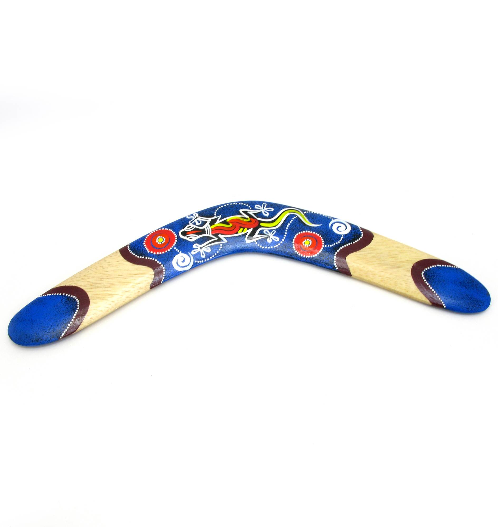 Этот бумеранг является двухсторонним, расписным в синей цветовой гамме и изготовлен из дерева. Он имеет размеры 30х10х1 см и отлично подходит для активного отдыха на свежем воздухе.