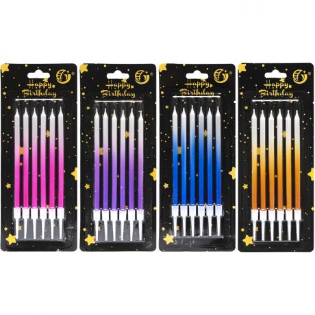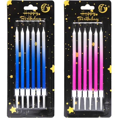 Цей набір включає 6 свічок для торта. Кожна свічка має довжину 11 см та діаметр 5 мм. Свічки представлені в різних кольорах.