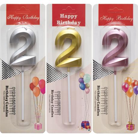 Це свічка, яка має форму цифри "2". Вона виготовлена в металіковому стилі. Розмір цифри становить 5 см. Свічка поставляється в блістерній упаковці.