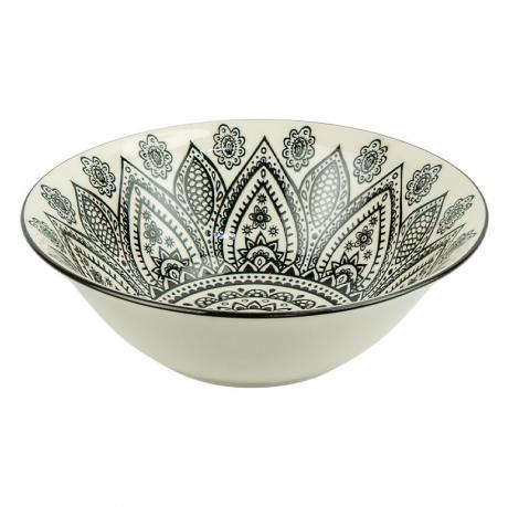 Тарілка з чорно-білим візерунком у стилі мандали, діаметром 17 см, висотою 7,5 см та об’ємом 500 мл. Дизайн складається з концентричних кіл із квітковими та геометричними мотивами, створюючи ефект гармонії та симетрії. Чіткі лінії та контрастні кольори роблять її витонченою та універсальною для будь-якого інтер’єру, підходить для подачі салатів, каш, десертів та гарнірів.