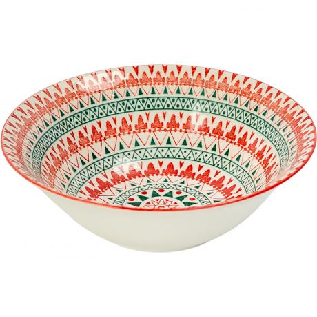 Елегантна керамічна тарілка з етнічним орнаментом у червоно-зелених тонах стане стильним доповненням вашого столу. Завдяки об’єму 500 мл чудово підходить для перших страв, салатів або фруктів. Виготовлена з якісної кераміки, зручна у використанні та легка в догляді.