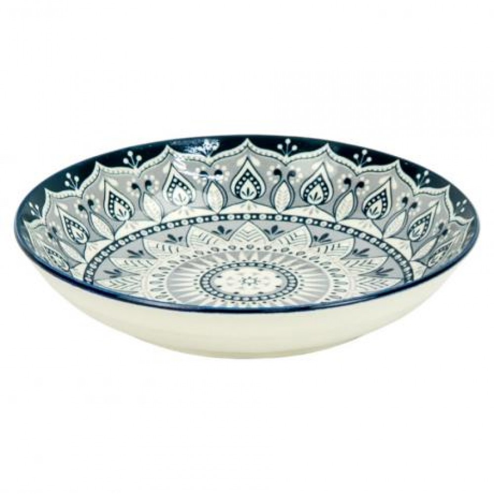 Тарілка з витонченим геометричним орнаментом у синьо‑білій гамі. Центральна частина прикрашена концентричними візерунками з рослинними та краплеподібними мотивами, що створюють ефект мандали. Тонкі лінії та симетричний малюнок надають виробу сучасного та стильного вигляду.