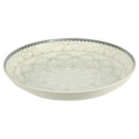 Керамічна тарілка універсального призначення діаметром 20,5 см і висотою 5,5 см, об’єм 500 мл. Виготовлена з міцної кераміки кремового кольору та оздоблена витонченим світло-сірим орнаментом у вигляді мандали, що надає виробу стриманого й елегантного вигляду. Мінімалістичний дизайн гармонійно поєднується з будь-яким сервіруванням. Тарілка підходить для щоденного використання та ідеальна для подачі супів, салатів, пасти, каш і других страв.