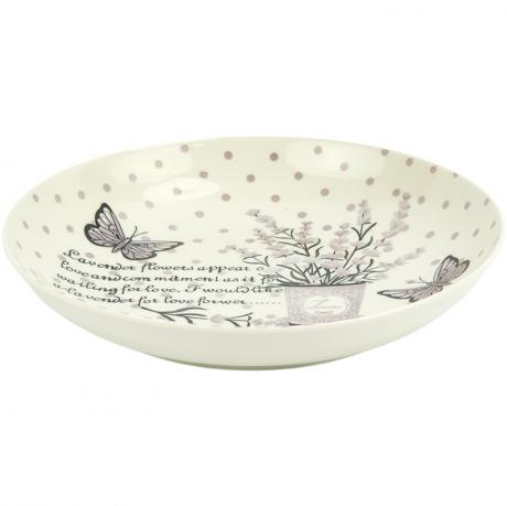 Тарілка з ніжним лавандовим дизайном, прикрашена квітами лаванди, метеликами та англійським написом. Фон із точками та смугами в пастельних фіолетових тонах додає посуді романтичності та затишку.