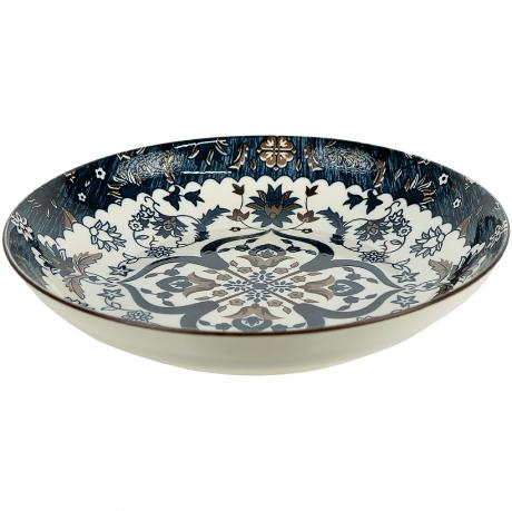 Керамічна тарілка з виразним східним орнаментом у насичених синіх, коричневих і білих відтінках. Діаметр 23 см, висота 6,5 см, об’єм 700 мл. Виготовлена з міцної кераміки з глянцевим покриттям, яке підкреслює деталізований візерунок та робить тарілку яскравим елементом сервірування. Підходить для подачі супів, пасти, гарнірів, салатів і других страв. Підійде як для щоденного використання, так і для святкового столу.