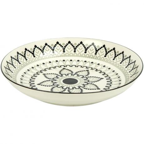 Тарілка з елегантним чорно-сірим геометричним орнаментом у стилі мандали. Симетричний квітковий візерунок із листковими елементами та точковими деталями створює сучасний і водночас витончений вигляд.