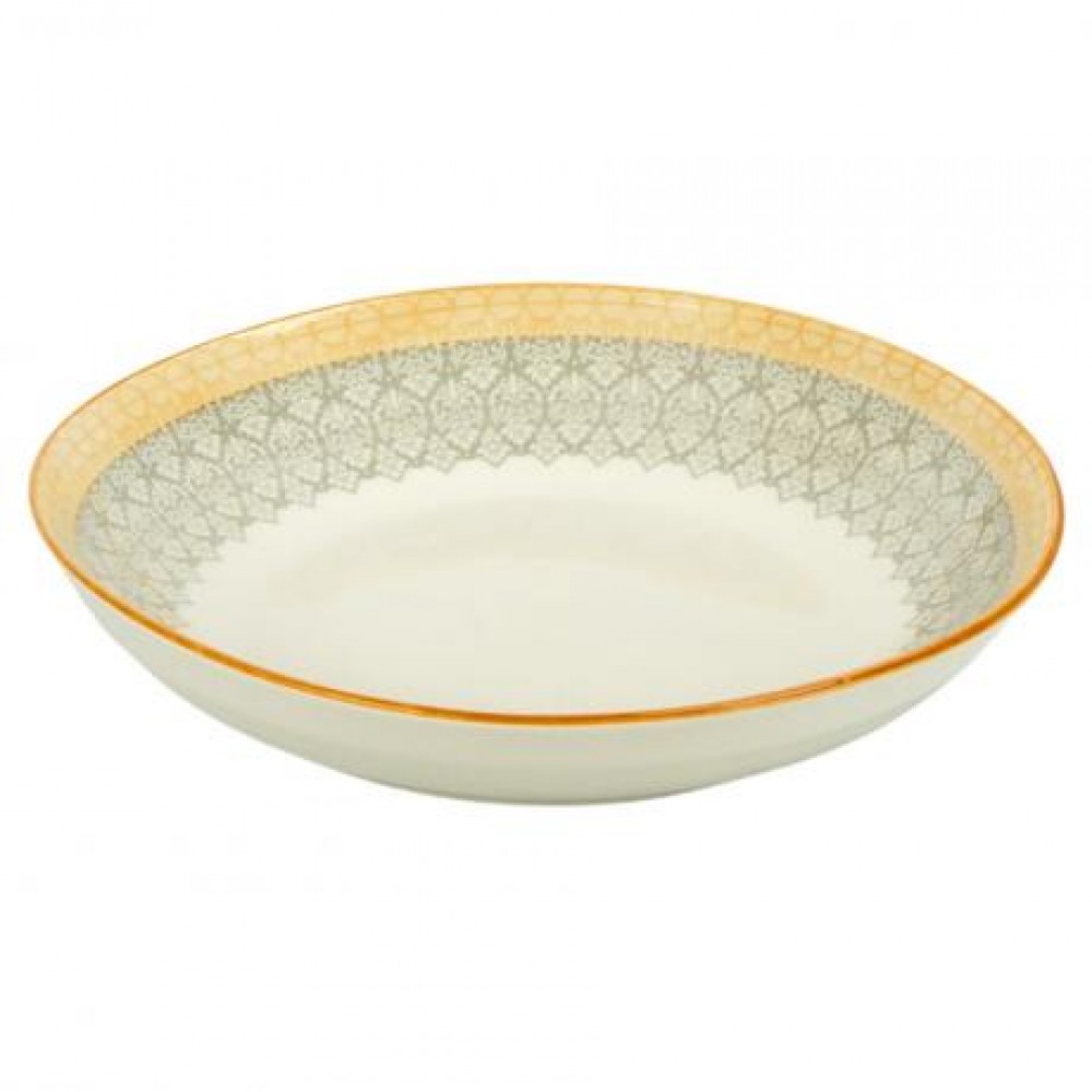 Виготовлена з міцної білої кераміки. Прикрашена витонченим геометричним візерунком і яскравою помаранчевою каймою, що надає посуді сучасного та елегантного вигляду.