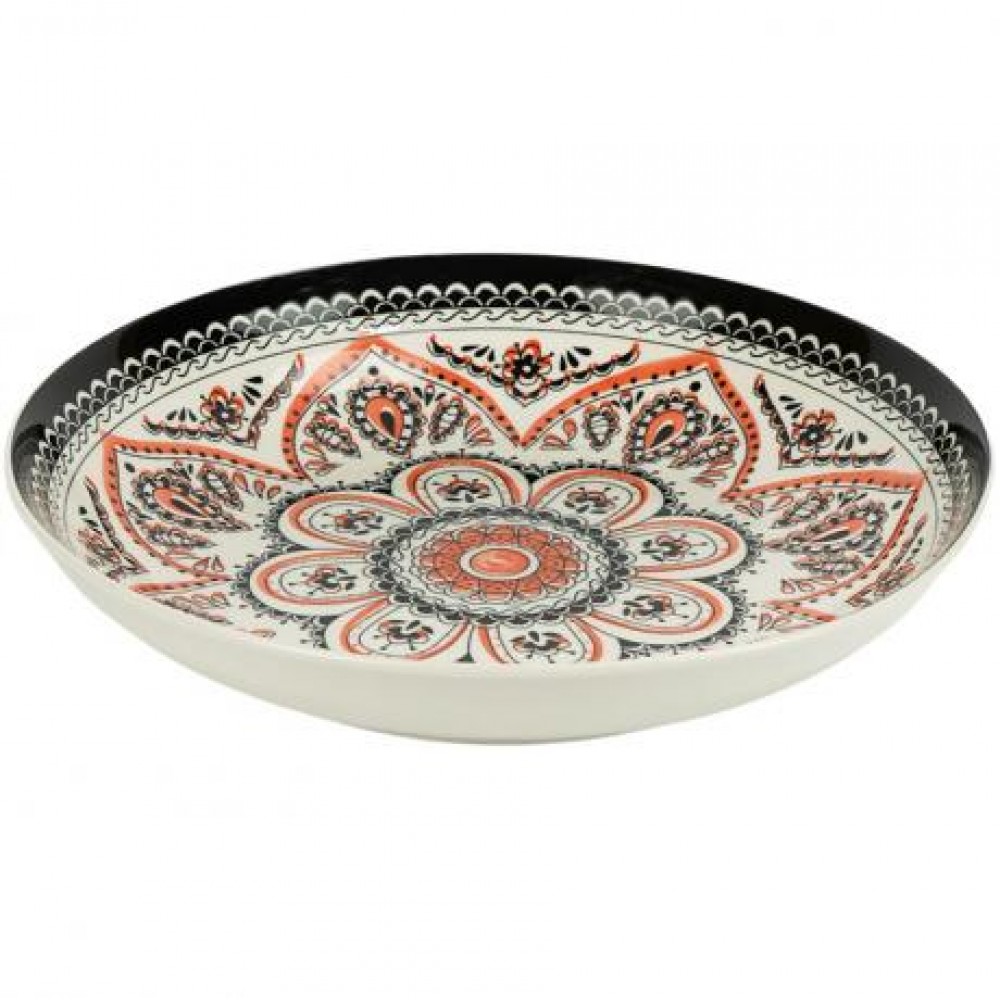 Тарілка з яскравим помаранчево-чорним східним орнаментом, у центрі якої розташований великий квітковий візерунок, оточений краплеподібними та квітковими елементами. Деталізований малюнок створює ефект ручного розпису, роблячи сервірування ефектним та стильним. Діаметр 23 см, висота 6,5 см, об’єм 700 мл. Ідеально підходить для подачі супів, пасти, салатів та других страв.