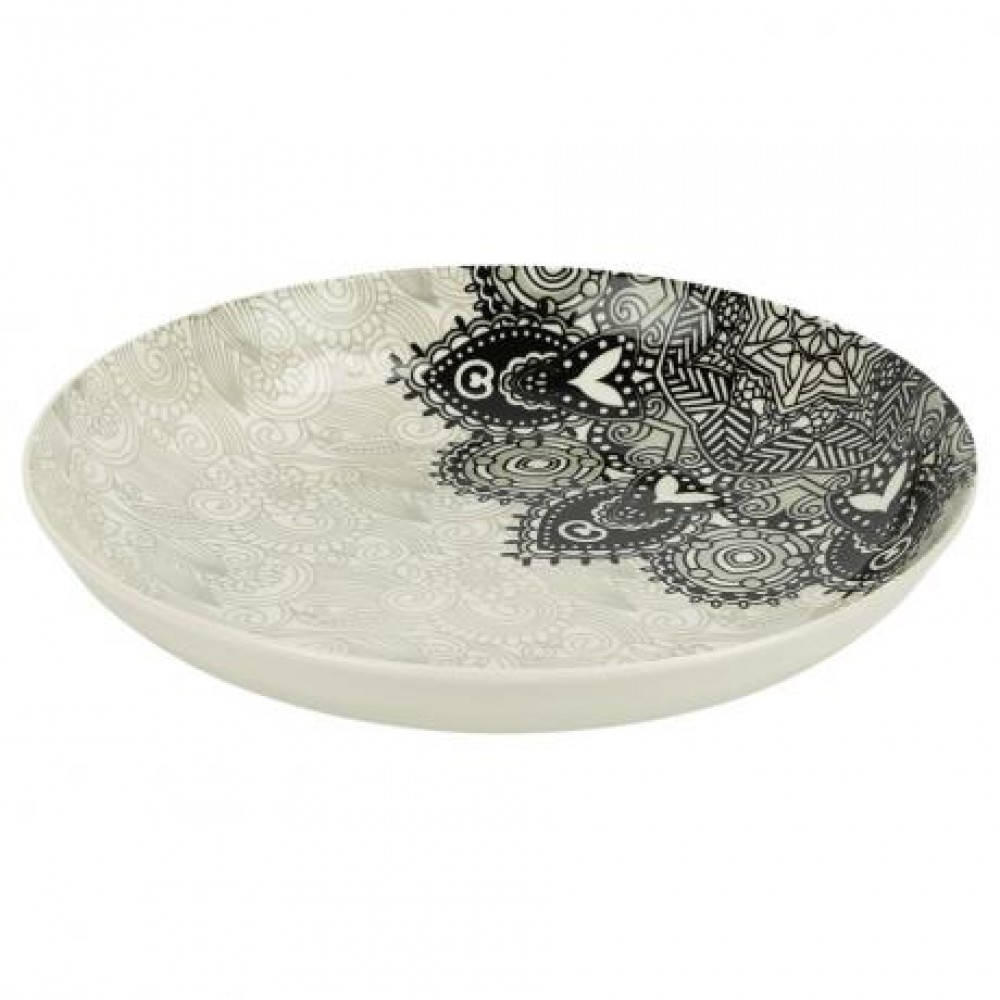 Тарілка з вишуканим чорно-білим візерунком: на світлому фоні з тонкими сірими квітково-хвилястими лініями виділяється насичений чорний мереживний орнамент із сердечками та геометричними елементами. Контрастний дизайн створює сучасний і стильний акцент на сервіруванні.
