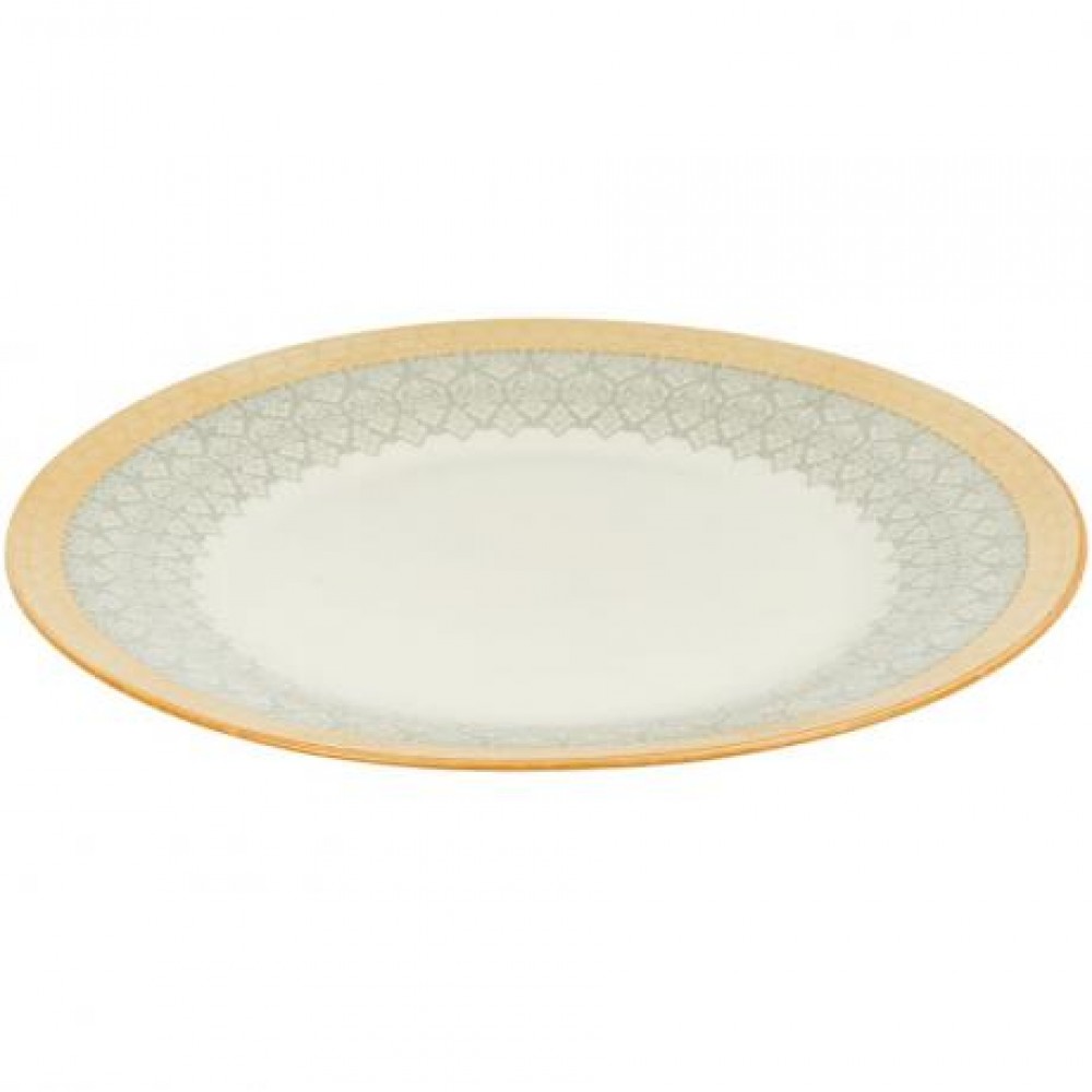 Обідня тарілка D27 см з витонченим орнаментом. Центральна частина біла, а по краю розташований сірий візерунок у східному стилі, доповнений теплою жовтою каймою з м’яким градієнтом. Тарілка чудово підходить для подачі гарячих страв, салатів та гарнірів, створюючи затишну атмосферу за столом.