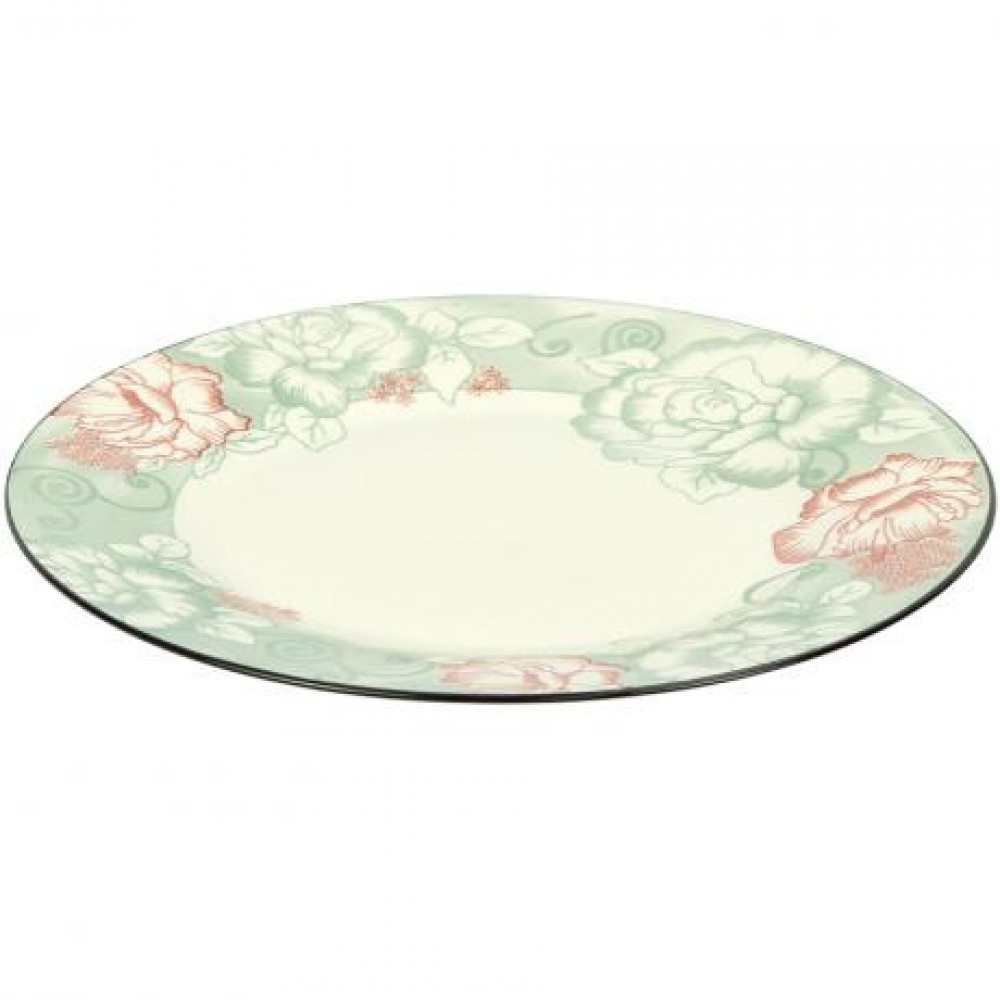 Пласка тарілка діаметром 27 см з витонченим ніжно-зеленим візерунком та рожевими квітами. Елегантний посуд підходить для подачі гарячих страв, салатів та закусок. Органічно доповнить як повсякденну, так і святкову сервіровку столу.