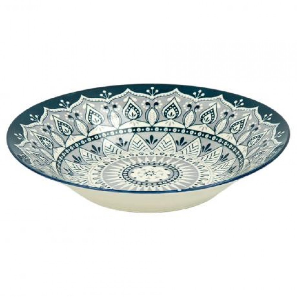 Супова тарілка D20×6 см, об’єм 500 мл, з яскравим східним орнаментом у синіх і білих тонах. Декор виконаний у вигляді кругового мандалоподібного візерунка з листям та крапковими елементами, що створюють ефект ручного розпису. Підходить для подачі супів, бульйонів та рагу, додаючи вишуканості сервіруванню.