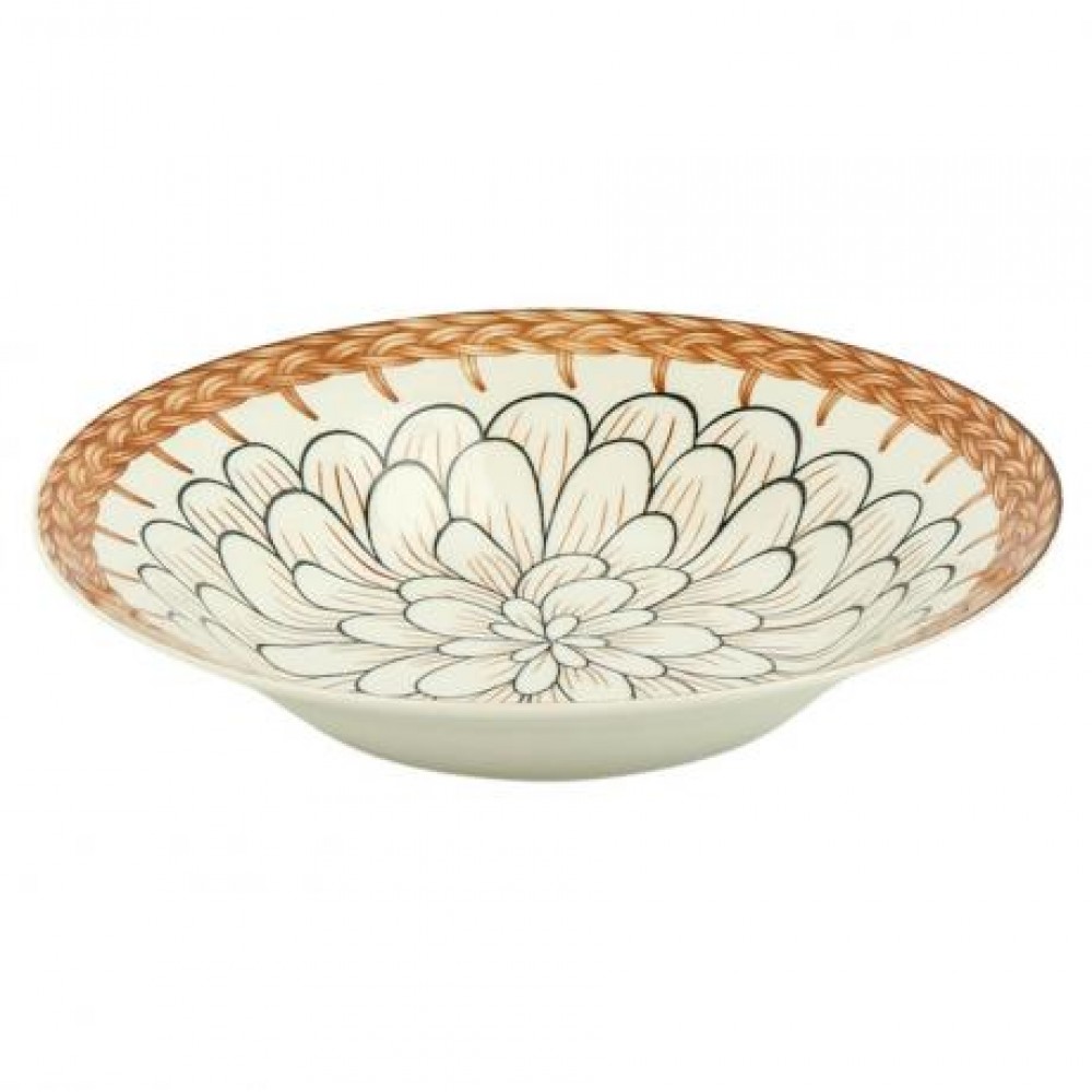 Супова тарілка з плетеним коричневим обідком, діаметр 20 см, висота 6 см, об’єм 500 мл. Виготовлена з міцної кераміки з молочно-білою основою. Внутрішня частина прикрашена ніжним квітковим орнаментом, що гармонійно поєднується з обідком, надаючи тарілці затишного та натурального вигляду. Підходить для подачі супів, бульйонів та крем-супів, сервірування каш, пасти та рагу, подачі фруктів, салатів або закусок, а також для використання у повсякденному та святковому сервіруванні столу.