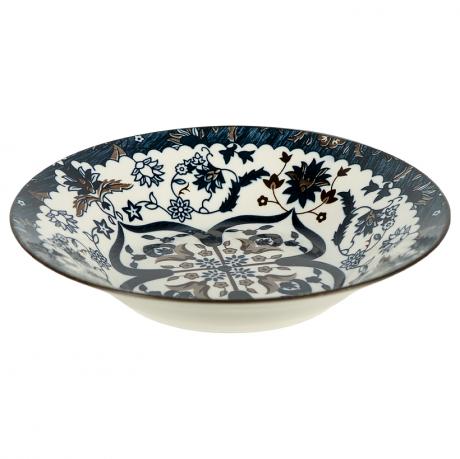Супова керамічна тарілка діаметром 20 см і висотою 6 см, об’єм 500 мл. Дизайн виконаний у виразному етнічному стилі з симетричним орнаментом у синьо-білих та коричневих відтінках. Центральний візерунок і декоративна окантовка по краю надають виробу насиченого та елегантного вигляду. Тарілка виготовлена з міцної кераміки з глянцевим покриттям, підходить для щоденного використання. Ідеально підходить для подачі супів, рагу, пасти, салатів та інших страв, а також для стильного сервірування столу.