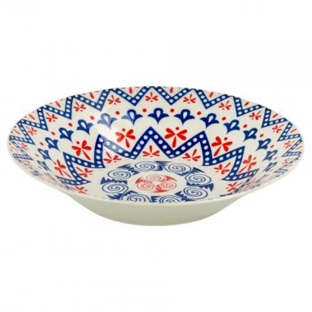 Супова тарілка діаметром 20 см, висотою 6 см, об'ємом 500 мл. Виготовлена з білої кераміки та прикрашена яскравим геометричним візерунком у синьо-червоних тонах з елементами хвиль та квітів. Ідеально підходить для подачі супів, крем-супів та рагу.