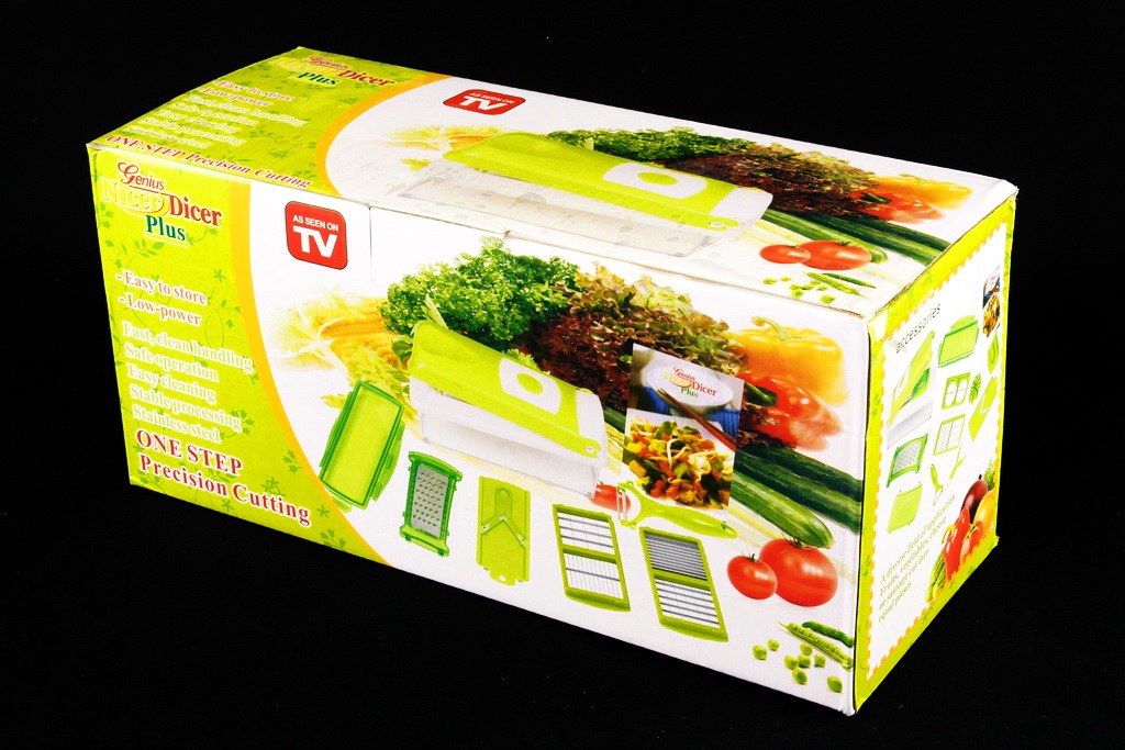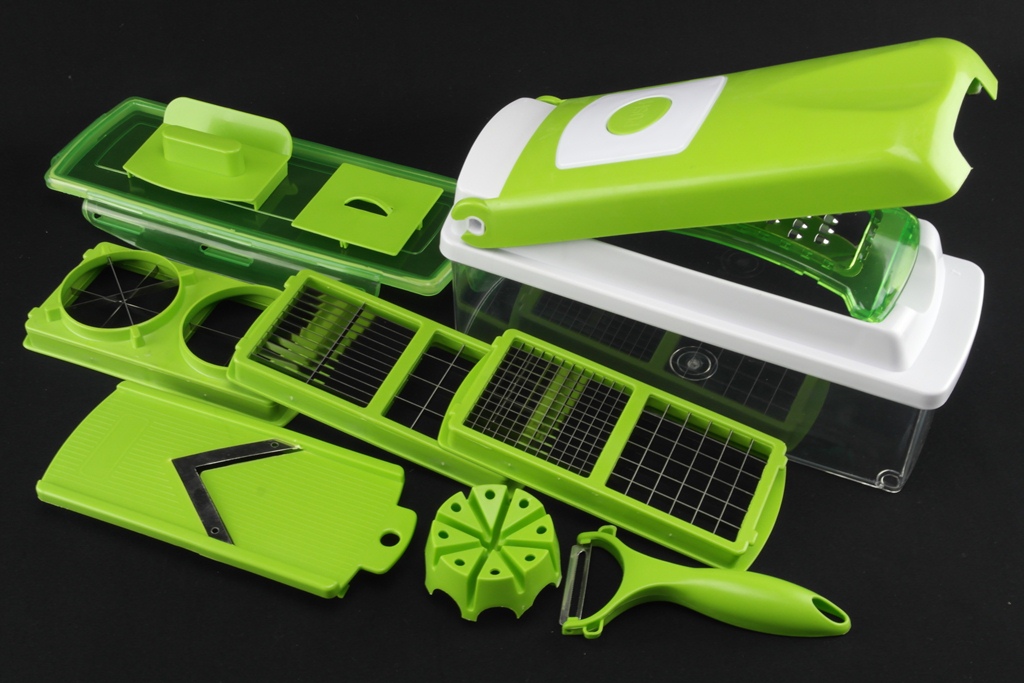 Уникальное приспособление изготовлено из нержавеющей стали и специального пластика, что обеспечивает данному товару долговечность и надежность использования в приготовлении пищи. С помощью этого набора с различными насадками Вы легко измельчите различные продукты (овощи, фрукты, мясных изделий, сыр и т.д.), нарежите кусочками любой конфигурации и размера в домашних условиях, кафе и ресторанах. Насадки позволяют получить при нарезании кубики, соломку, пластинки, разрезать на 4 или 8 частей. Благодаря прозрачному контейнеру полученые заготовки можно оставить на «потом» закрыв герметичной крышкой. Настоящий помощник на Вашей кухне - позволяет просто, красиво и безопасно нарезать, нашинковать, сохранить. Набор состоит из: контейнера со съемной верхней часть с кнопкой очистки, режущей базы, насадки с ножами для нарезания, вставного режущего толкателя, частичной крышки для лезвий partial blade cover, инструмента для удаления шелухи, ножа для очистки, терок, герметичной крышки. Товар имеет заводскую герметичную упаковку. Насадки легко меняются, моються и не впитывают посторонние запахи.