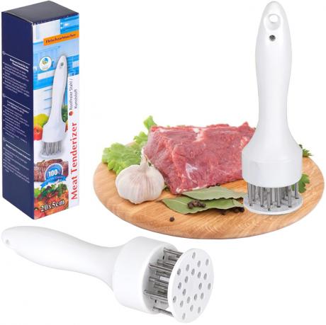 Тендерайзер для м’яса — зручний інструмент для розм’якшення та підготовки м’яса перед приготуванням. Розмір — 20×5 см. Робоча частина оснащена металевими голками з нержавіючої сталі, які проколюють волокна, роблячи м’ясо м’якшим і сприяючи кращому проникненню маринаду. Корпус виготовлений із пластику, ручка зручної форми з отвором для підвішування. Компактний і простий у використанні. Упакований у коробку розміром 20×5×5 см. Ціна вказана за 1 одиницю товару. Товар вигідний для оптових магазинів і підходить для роздрібного продажу.