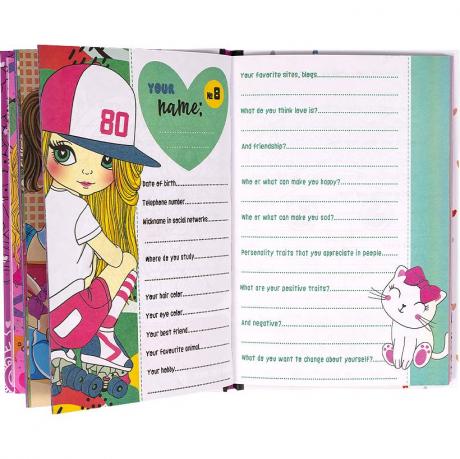 Анкета для дівчаток формату А5 містить 48 аркушів. Обкладинка з матовим ламінуванням, вибірковим лаком і гліттером. Розміри 135 x 197 мм. Виконана українською мовою.