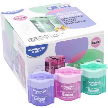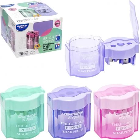 Точилка з контейнером і трьома лезами. Дві точилки діаметром 8,2мм і довжиною леза 21мм. Одна точилка діаметром 10,2мм, довжиною леза 27 мм Кольори в асортименті. В упаковці 24 шт. Розмір 5,5*5,5 см