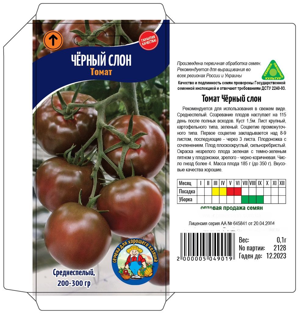 Рекомендуется для использования в свежем виде. Среднеспелый. Созревание плодов наступает на 115 день после полных всходов. Куст 1,5 м. Лист крупный, картофельного типа, зеленый. Соцветие промежуточного типа. Первое соцветие закладывается над 8-9 листом, последующие – через 3 листа. Плодоножка с сочленением. Плод плоскокруглый, сильноребристый. Окраска незрелого плода зеленая с темно-зеленым пятном у плодоножки, зрелого – черно-коричневая. Число гнезд более 4. Масса плода 185 г (до 350 г). Вкусовые качества хорошие.