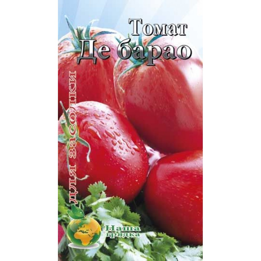Томат "Де-Барао"красный Среднепоздний сорт томатов. После того как появились всходы, приблизительный срок созревания составляет 120-130дней. Растение высокорослые. Может вырастать более 2-х метров в высоту. Цвет плода розовый. Форма сливовидная. Плод может вырастать массой до 90грамм. Урожайность может составлять до 4-х кг с одного куста. Хорошо подходит для консервирования. Агротехника: Подходит для выращивания в закрытом грунте. Данный сорт необходимо выращивать на 10 дней раньше, чем другие томаты. Прекрасно подходит для употребления в свежем виде, а также для консервирования. Хорошая транспортабельность и лежкость. Хорошими предшественниками для помидоров являются капуста, лук, бобовые, морковь, огурцы. Помидоры лучше выращивать через рассаду. Хорошее время для этого с конца марта по начало апреля. Глубина посадки до 3см. Перед тем как сажать рассаду, семена следует обработать раствором марганцовки, а потом промыть их водой. В теплицу рассаду высаживают в мае, в возрасте 60-65дней. Уход заключается в регулярном поливе теплой водой. Высокорослые томаты обязательно нужно подвязывать и удалять нижние пасынки! Плоды интересны универсальностью использования: они одни из самых лучших для всех видов консервирования и приготовления свежих салатов.Предназначен для выращивания во всех зонах Украины. Семена томатов прошли предпосевную обработку и проверку на всхожесть Семена соотвествуют ДСТУ 2242-93